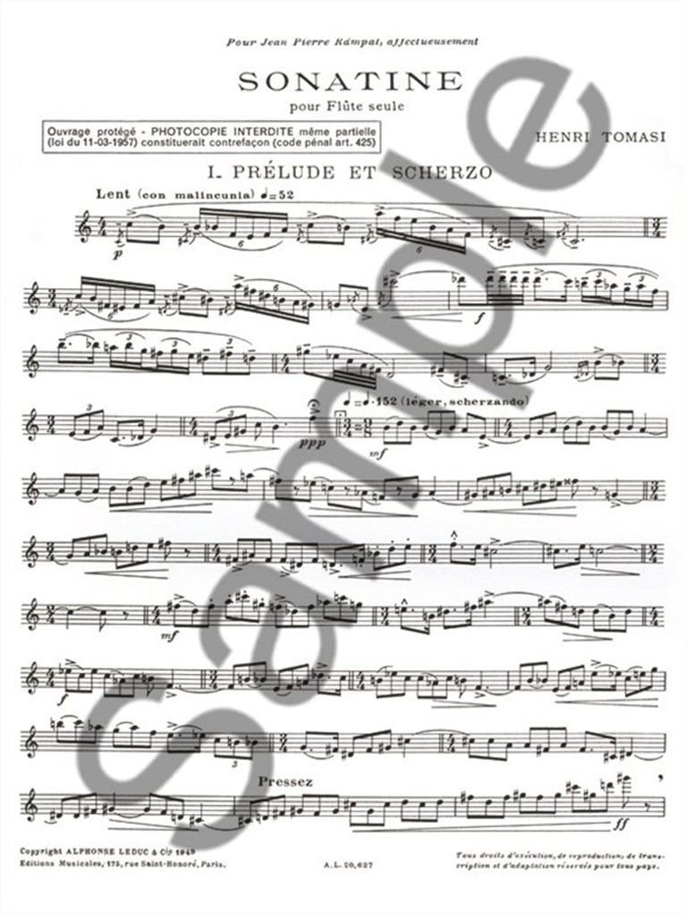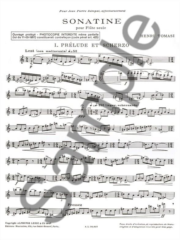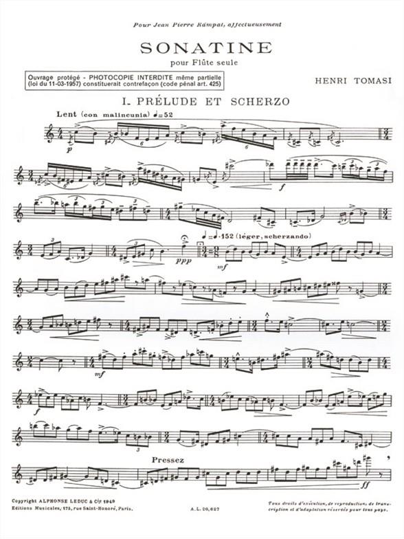Le compositeur et chef d’orchestre français Henri Tomasi (1901-1971) a publié la Sonatine pour flûte solo en 1949. Comme pour ses autres compositions pour vents, Sonatine fut bien accueillie par le public. Tomasi est né à Marseille, mais son père et sa mère étaient originaires de La Casinca en Corse. Malgré la pression de ses parents pour étudier la musique, Tomasi rêvait de devenir marin et, durant l’été, il séjourna chez sa grand-mère en Corse où il apprit des chansons traditionnelles corse. Cependant, en 1921, il commença ses études au Conservatoire de Paris et devint un compositeur et chef d’orchestre de renom. Tomasi n’oubliait pas ses parcours corses, intégrant souvent des thèmes des chansons apprises durant les étés avec sa grand-mère dans ses compositions. La Sonatine pour flûte solo est une œuvre très inhabituelle, complexe et moderne en trois mouvements ; 1) Prélude et Scherzo, 2) Pastorale, et 3) Finale. Cette pièce Tomasi convient aux flautistes avancées, offrant un ajout alternatif et passionnant au répertoire de l’instrument.