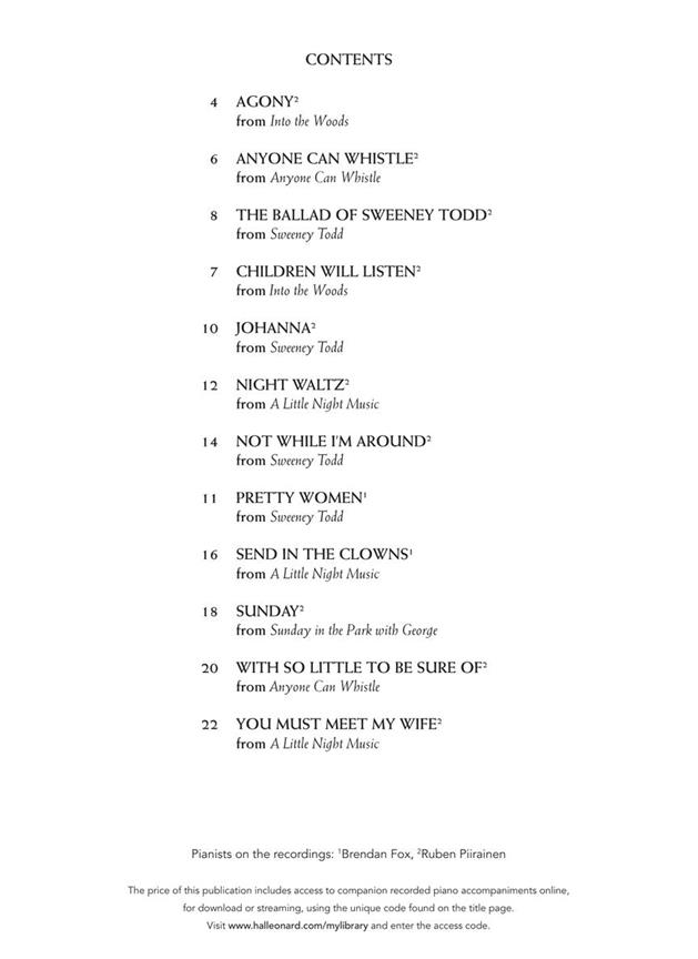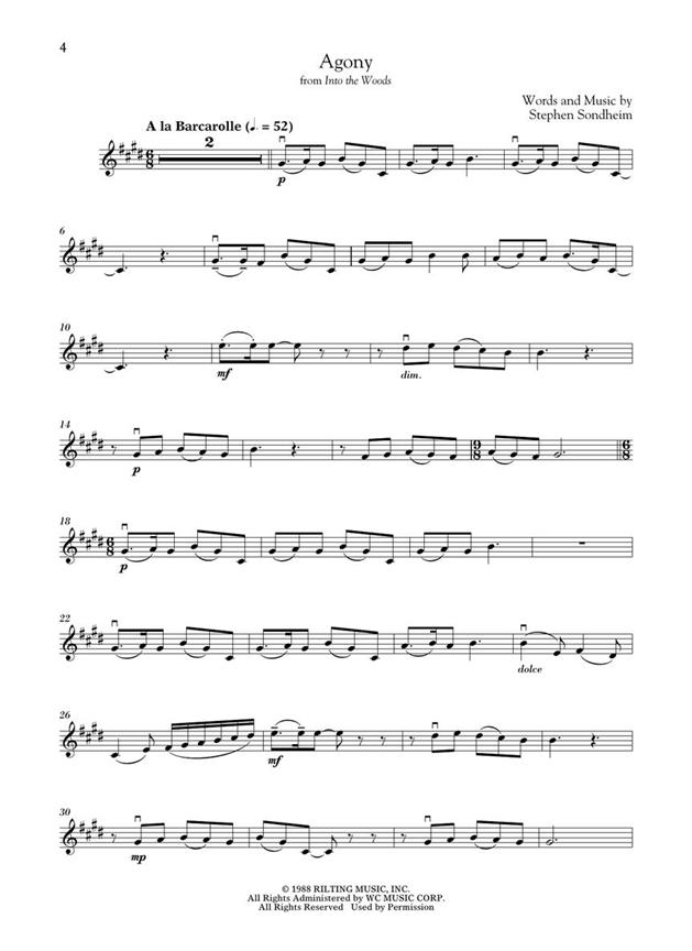 This collection features intermediate-level arrangements for violin and piano accompaniment in a range flattering to the violin. The music has been edited with added dynamics, articulations and phrasing, making it appropriate for lessons or performances. The accompaniments have been recorded on an acoustic grand piano. Includes separate pull-out solo part. Songs include: Agony · Anyone Can Whistle · The Ballad of Sweeney Todd · Children Will Listen · Green Finch and Linnet Bird · Johanna · Night Waltz · Not While I'm Around · Pretty Women · Send in the Clowns · Sunday · With So Little to Be Sure Of. The price of this book includes a unique code that provides access to audio tracks online, for download or streaming. The tracks include PLAYBACK+, a multi-functional audio player that allows you to slow down audio without changing pitch, set loop points, change keys, and pan left or right - available exclusively from Hal Leonard.