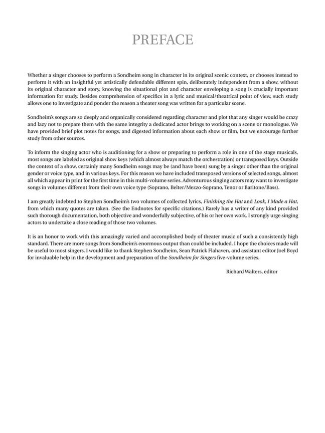 Chaque volume propose une liste de contenus différente et inclut des chansons dans les tonalités originales, ainsi que des transpositions appropriées. Une section introductive approfondie, présentant des résumés de l’intrigue et des commentaires de Sondheim sur sa musique et ses spectacles, est également incluse.