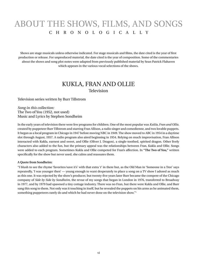 Each volume has a different contents list and includes songs in original keys, as well as appropriate transpositions. An extensive introductory section, featuring plot synopses and comments from Sondheim about his music and shows, is also included.
