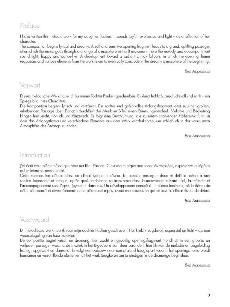 J’ai écrit cette pièce mélodique pour ma fille, Paulien. C’est une musique aux sonorités enjouées, expressives et légères qui reflètent sa personnalité. Cette composition débute dans un climat lyrique et rêveur. Le premier passage, doux et délicat, mène à une section imposante et tonique, après quoi l’ambiance se transforme dans le mouvement suivant : ici, la mélodie et l’accompagnement sont légers, joyeux et dansants. Un développement conduit à un climax lumineux, où le thème du début réapparaît et divers éléments de la pièce sont repris, avant une conclusion qui retrouve le climat rêveur du début. - Bert Appermont
