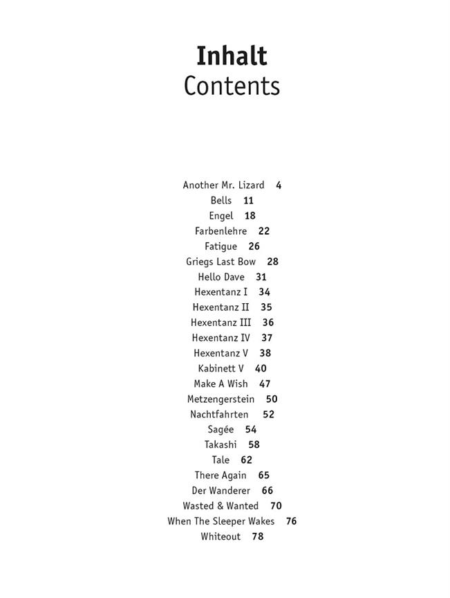 Another Mr. Lizard Bells Engel Farbenlehre Fatigue Griegs Last Bow Hello Dave Hexentanz I Hexentanz II Hexentanz III Hexentanz IV Hexentanz V Kabinett V Make A Wish Metzengerstein Nachtfahrten Sagée Takashi Tale There Again Der Wanderer Wasted and Wanted When The Sleeper Wakes Whiteout