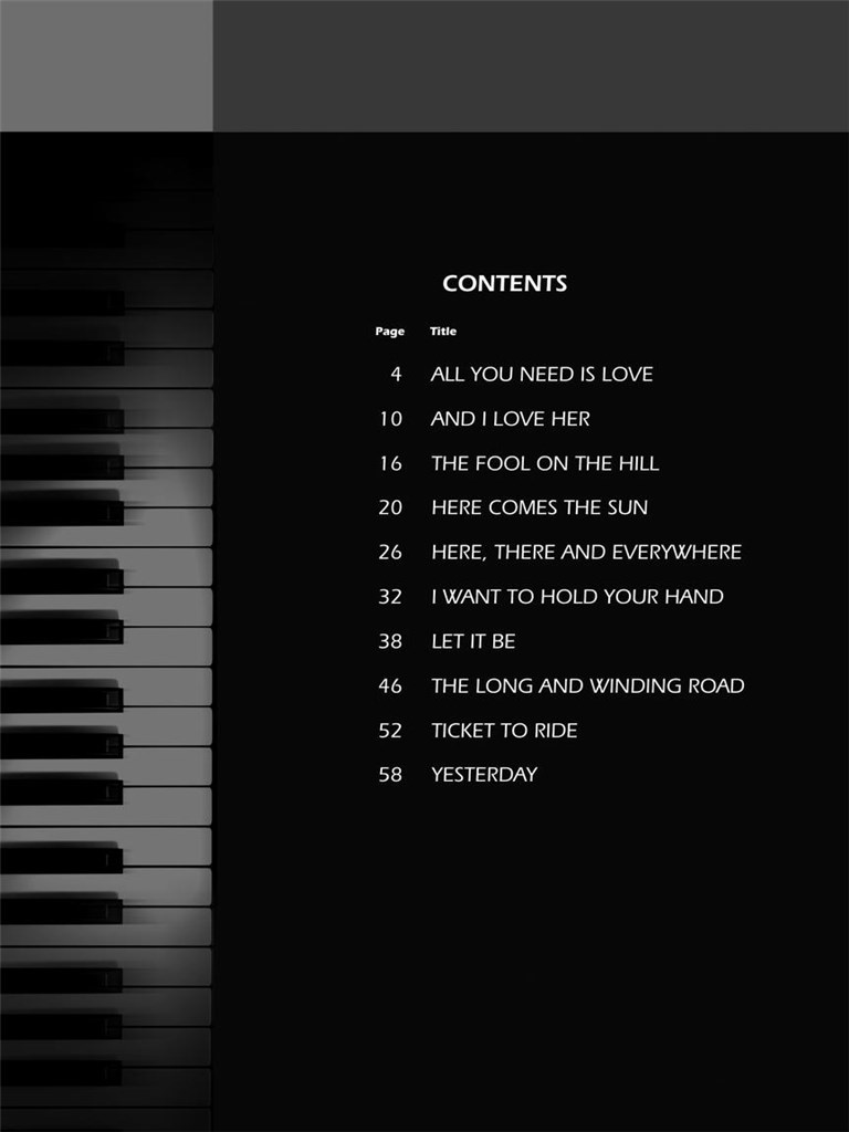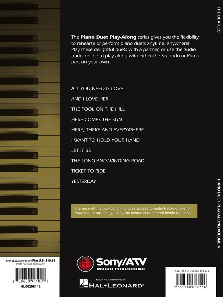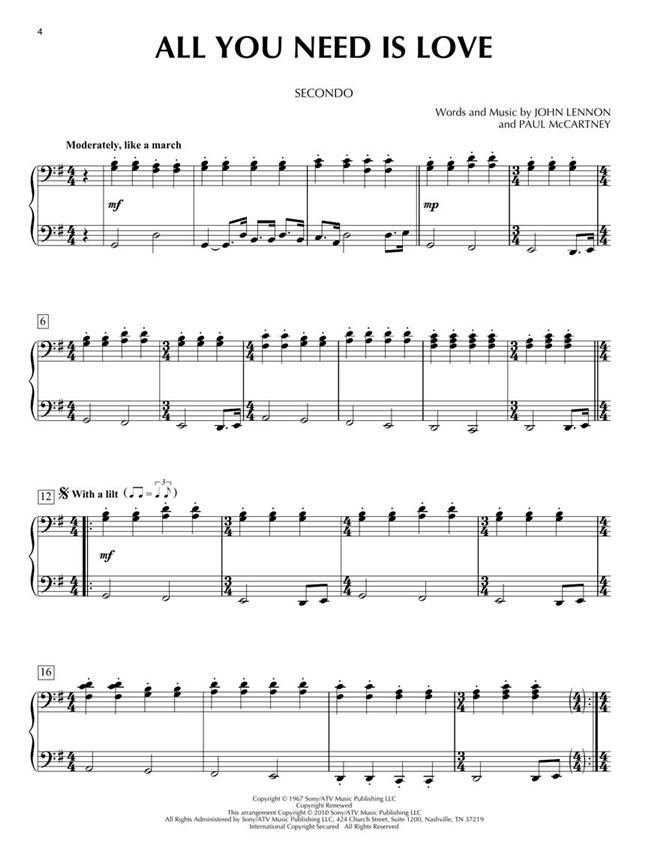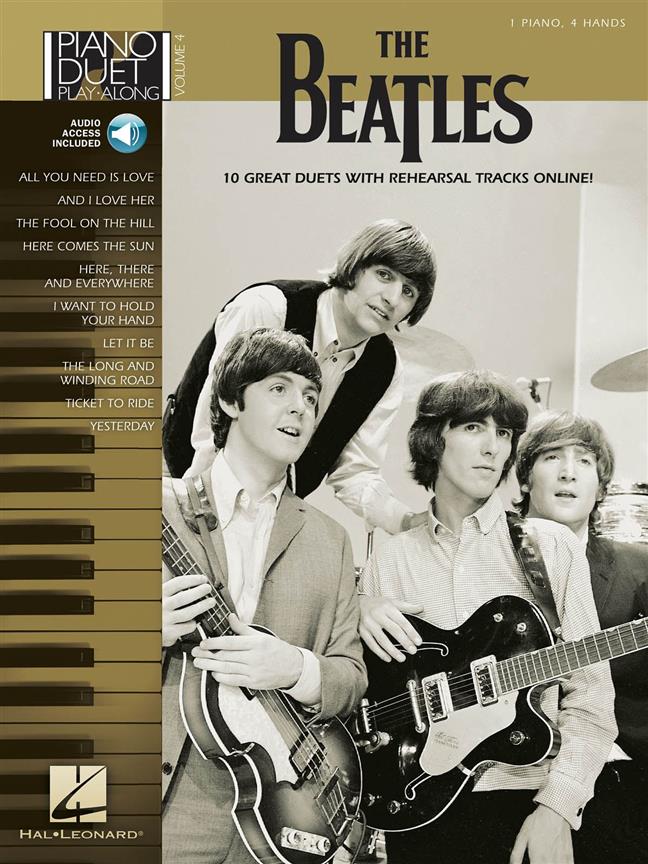 10 great piano duet arrangements of Beatles classics! Purchase of the book includes audio tracks for both Primo and Secondo parts - perfect for practice and performance! A demo of both parts is also included. 10 songs: All You Need Is Love - And I Love Her - The Fool on the Hill - Here Comes the Sun - Here, There and Everywhere - I WAnt to Hold Your Hand - Let It Be - The Long and Winding Road - Ticket to Ride - Yesterday. 10 great piano duet arrangements of Beatles classics! Purchase of the book includes audio tracks for both Primo and Secondo parts - perfect for practice and performance! A demo of both parts is also included.
