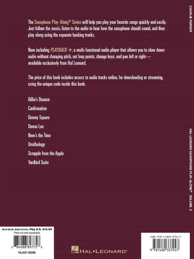 La série Saxophone Play-Along® vous aidera à jouer vos chansons préférées rapidement et facilement. Il suffit de suivre la notation, d’écouter l’audio inclus pour entendre comment le saxophone doit sonner, puis de jouer en même temps en utilisant les pistes d’accompagnement séparées. La mélodie et les paroles sont également incluses dans le livre pour vous aider à suivre. L’audio en ligne est disponible en streaming ou en téléchargement via le code unique imprimé à l’intérieur du livre. Le volume 5 comprend 8 favoris de Charlie Parker, notamment : Billie’s Bounce (Bill’s Bounce) - Confirmation - Dewey Square - Donna Lee - Now’s the Time - Ornithology - Scrapple from the Apple - Yardbird Suite.