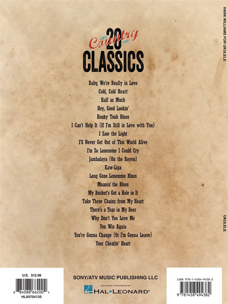 20 classiques arrangés pour les pays experte ukulélé, y compris: Cold, Cold Heart - Hey, Good Lookin' - Honky Tonk Blues - I Saw the Light - I'm So Lonesome I Could Cry - Jambalaya (On the Bayou) - Long Gone Lonesome Blues - There's a Tear in My Beer