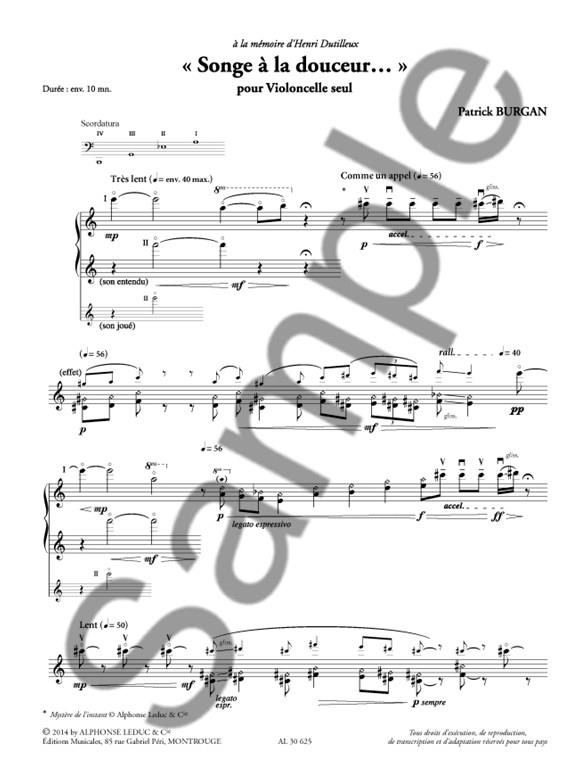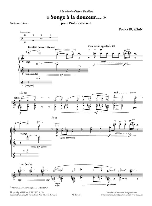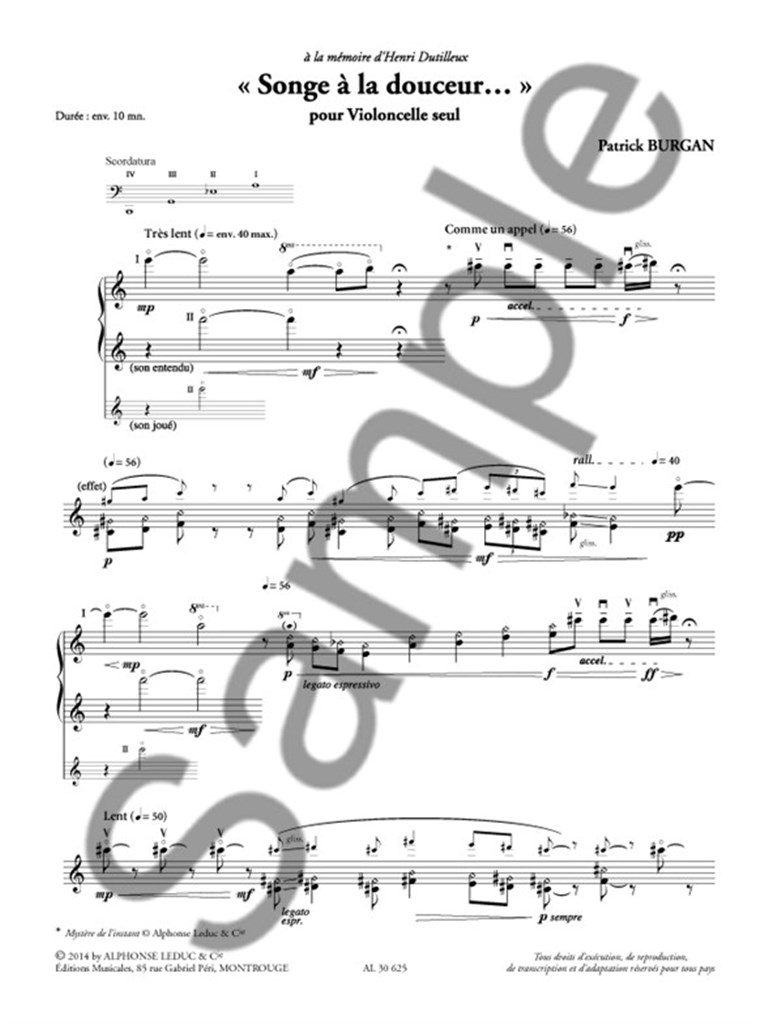 The composer Patrick Burgan and the giant of French music Henri Dutilleux formed real elective affinities with each other. Dutilleux never missed an opportunity to mention the high esteem in which he held the younger musician's work. Dedicated to the memory of Henri Dutilleux, Songe À La Douceur takes its title from the 2nd verse of 'L'Invitation au Voyage', from the 'Fleurs du mal' by Baudelaire - a poet who was a constant source of inspiration for Dutilleux.