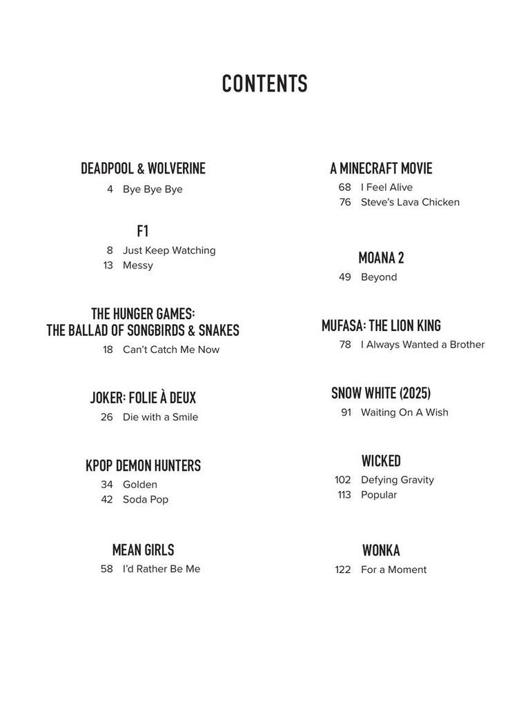 Écoutez la bande originale des plus grands films du jour ! Faites vivre la magie du cinéma avec cette collection passionnante de 16 chansons inoubliables issues des meilleurs films du moment. De l’univers enchanteur de Wicked aux moments d’action de Kpop Demon Hunters et Minecraft, ces tubes très appréciés des fans sont arrangés pour piano, voix et guitare. Chaque arrangement comprend des symboles d’accords, des cadres d’accords de guitare et des paroles complètes, ce qui facilite la lecture et le chant. Les chansons mises en vedette incluent des succès et des titres forts comme Defying Gravity, Can’t Catch Me Now, Die with a Smile, Popular, et bien d’autres. Parfait pour les pianistes, guitaristes, chanteurs et cinéphiles, ce recueil de chansons vous permet de revivre la magie du grand écran à chaque fois que vous jouez.