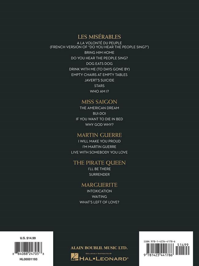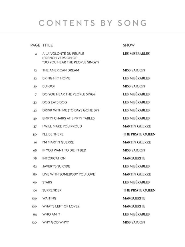 Chansons de misérables, Miss Saigon, Martin Guerre, la Reine Pirate et Marguerite dans les éditions pour voix avec accompagnement au Piano et une liste de contenu complètement différent pour les femmes et les hommes.