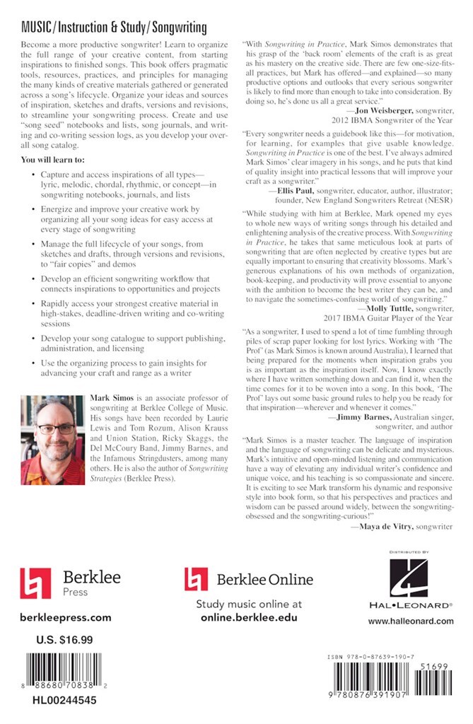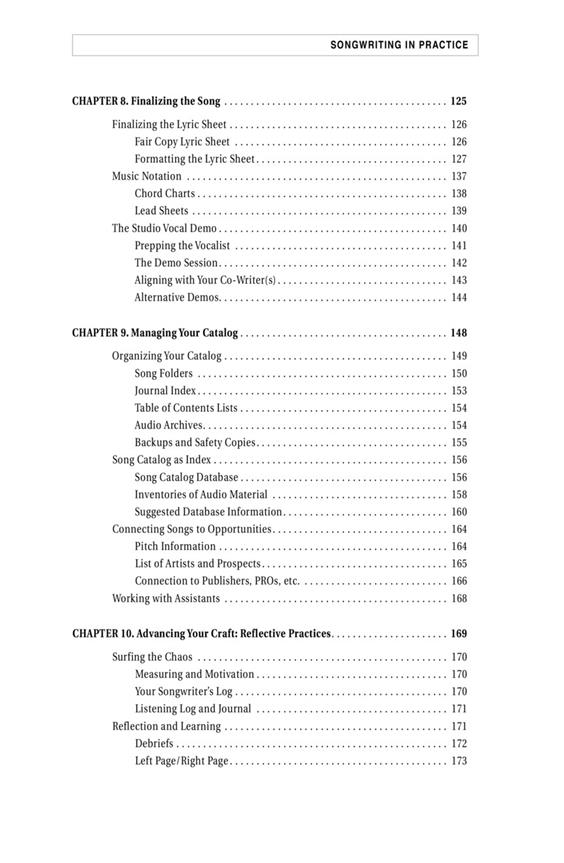 Become a more productive songwriter! Learn to organize the full range of your creative content, from starting inspirations to finished songs. This book offers pragmatic tools, resources, practices, and principles for managing the many kinds of creative materials gathered or generated across a song's life cycle. Organize your ideas and sources of inspiration, sketches and drafts, versions and revisions, to streamline your songwriting process. Create and use song seed notebooks and lists, song journals, and writing and co-writing session logs, as you develop your overall song catalog. You will learn to: · Capture and access inspirations of all types - lyric, melodic, chordal, rhythmic, or concept - in songwriting notebooks, journals, and lists · Energize and improve your creative work writing by organizing all your song ideas for easy access at every stage of songwriting · Manage the full lifecycle of your songs, from sketches and drafts, through versions and revisions, to fair copies and demos · Develop an efficient songwriting workflow that connects inspirations to opportunities and projects · Rapidly access your strongest creative material in high-stakes, deadline-driven writing and co-writing sessions · Develop your song catalogue to support publishing, administration, and licensing · Use the organizing process to gain insights for advancing your craft and range as a writer
