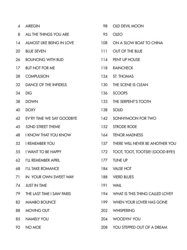 Le Sonny Rollins Omnibook célèbre la légende du bebop qui a travaillé avec Miles, Monk, MJQ et bien d’autres. Son travail en solo lui a valu de nombreuses distinctions, notamment des Grammy Awards, son élection à l’American Academy of Arts and Sciences, une médaille Edward MacDowell et la médaille des arts décernée par le président Barack Obama. Cette collection présente 50 de ses meilleurs exemplaires, notamment : Airegin · Tout ce que tu es · Presque comme être amoureux · Sauter avec Bud · Doxy · Chaque fois que nous disons au revoir · Je me souviendrai d’avril · Juste à temps · À savoir You · Oleo · Sur un bateau lent vers la Chine · Saint Thomas · Solide · Sonnymoon for Two · Vierd Blues · Woodyn' You · et plus encore.