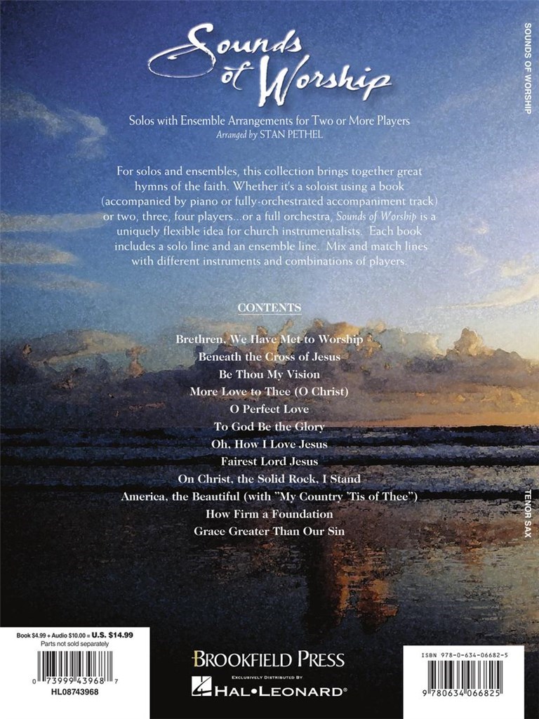 Des hymnes classiques ont été arrangés pour la série flexible « Sounds of ». Pour les solos et les ensembles, cette collection réunit de grands hymnes de la foi. Que ce soit un soliste utilisant un livre (accompagné d’une piste d’accompagnement orchestrée au piano) ou deux, trois, quatre musiciens... ou un orchestre complet, Sounds of Worship est une idée unique et flexible pour les instrumentistes d’église ! Chaque livre comprend une ligne solo et une ligne d’ensemble. Mélangez et combinez des lignes avec différents instruments et combinaisons de musiciens. Disponible : Partition du chef d’orchestre (avec CD d’acc.), Flûte, Hautbois, Trompette, Clarinette, Trombone, Cor, Saxophone alto, Saxophone ténor, Violon, Violoncelle, Basse/Tuba, Percussions, Piano/Rythme, CD d’accompagnement.