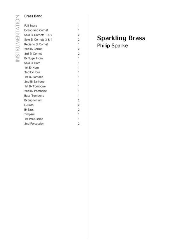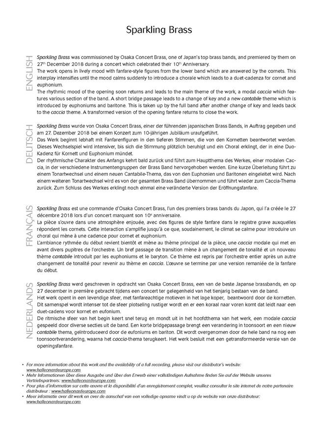 Sparkling Brass est une commande d’Osaka Concert Brass, qui l’a créée lors d’un concert marquant son 10e anniversaire. La pièce s’oeuvre dans une atmosphère enjouée, avec des figures de style fanfare dans le registre grave auxquelles répondent les cornets. Cette interaction s’amplifie jusqu’ ce que, soudainement, le climat se calme pour introduire un choral qui mène une cadence pour cornet et euphonium. L’ambiance rythmée du début revient bientôt et mène au thème principal de la pièce, une caccia modale qui met en avant divers pupîtres de l’orchestre. Un bref passage de transition mène un changement de tonalité et un nouveau thème cantabile introduit parles euphoniums et le baryton. Ce thème est repris par l’orchestre entier après un autre changement de tonalité pour revenir au thème en caccia. l'oeuvre se termine par une version transformée de la fanfare du début.