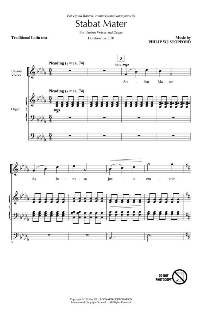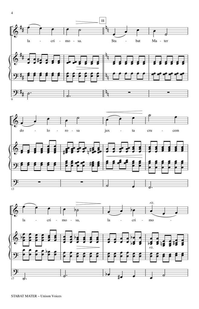 Initialement écrite en solo, cette mise en musique à l’unisson pour voix aiguës et orgue représente Marie debout au pied de la croix. Dans la musique, les phrases qui tombent représentent les pleurs de Mary – et les phrases qui montent, son chagrin et sa grande tristesse de cœur.