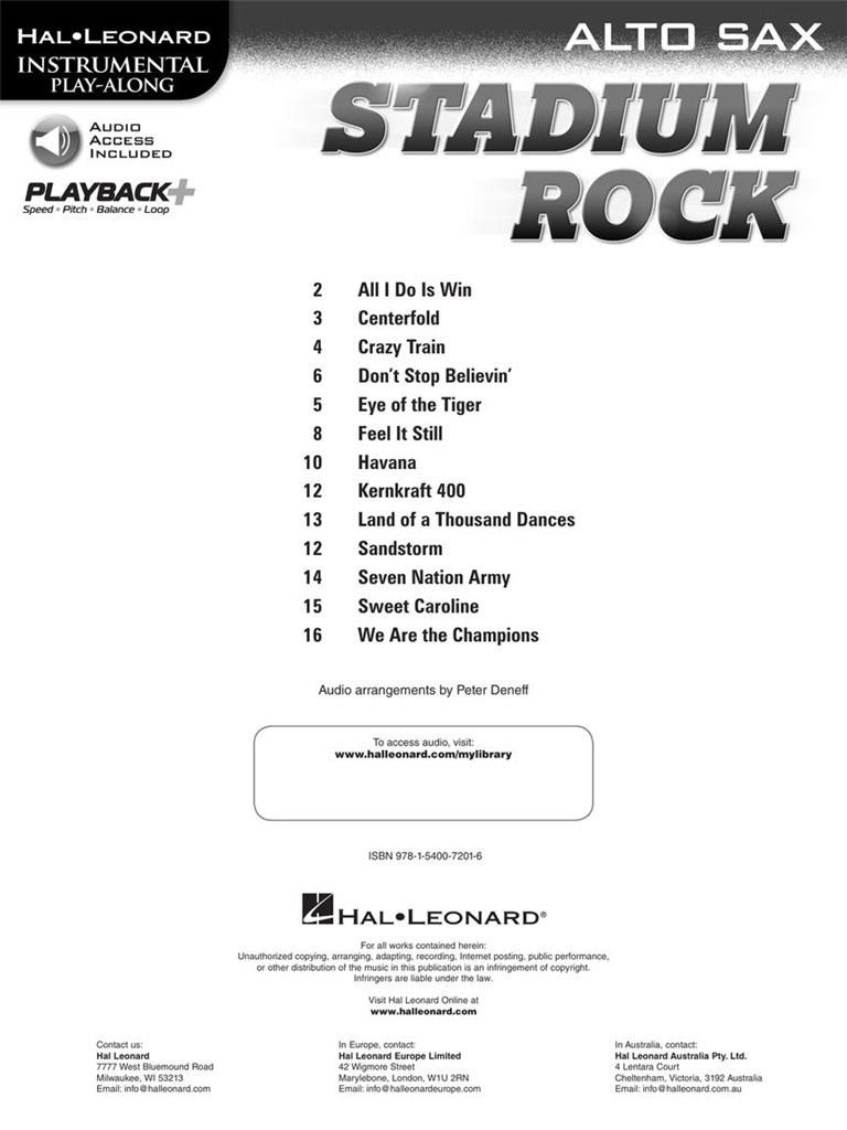 13 songs guaranteed to get the fans fired up, including: Crazy Train · Don't Stop Believin' · Eye of the Tiger · Havana · Seven Nation Army · Sweet Caroline · We Are the Champions · and more. Songs are arranged for instrumentalists and feature access to great demonstration and backing tracks so they can play along and sound like a pro! Audio is accessed online using the unique code inside the book and can be streamed or downloaded. The audio files include PLAYBACK+, a multi-functional audio player that allows you to slow down audio without changing pitch, set loop points, change keys, and pan left or right.