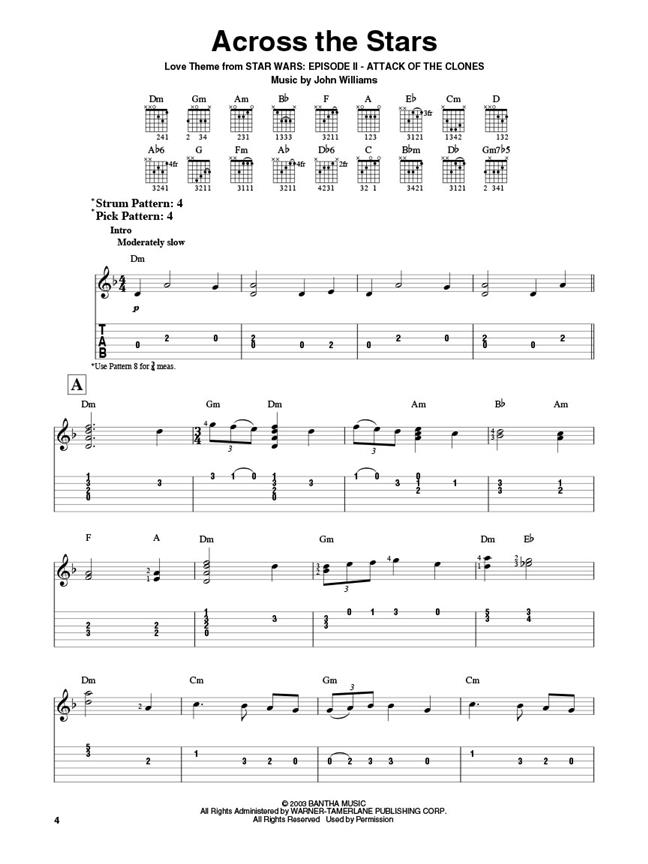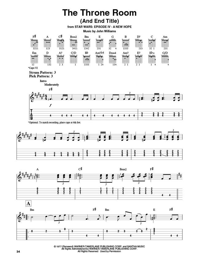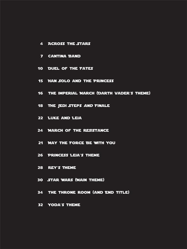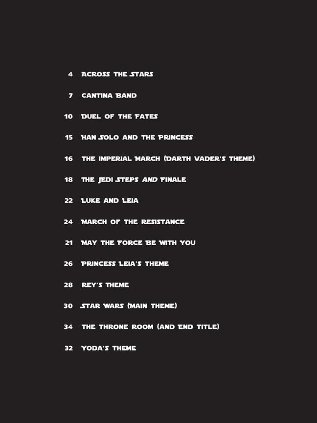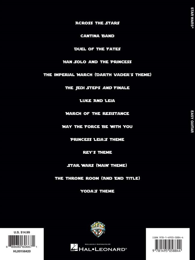 14 selections from all seven installments of John Williams compositions for Star Wars films, arranged and approved by John Williams for easy guitar. Includes: Across the Stars - Cantina Band - Duel of the Fates - Han Solo and the Princess - TheImperial March (Darth Vaders Theme) - The Jedi Steps and Finale - Luke and Leia - March of the Resistance - May the Force Be with You - Princess Leias Theme - Reys Theme - Star Wars (Main Theme) - The Throne Room (And End Title) - Yodas Theme. This collection for easy Guitar features 14 selections from all seven Star Wars films, arranged and approved by John Williams. Star Wars: Easy Guitar With Notes & Tab includes: Across the Stars, Cantina Band, Duel of the Fates, Han Solo and the Princess, The Imperial March (Darth Vader's Theme), The Jedi Steps and Finale, Luke and Leia, March of the Resistance, May the Force Be with You, Princess Leia's Theme, Rey's Theme, Star Wars (Main Theme), The Throne Room (And End Title) and Yoda's Theme.