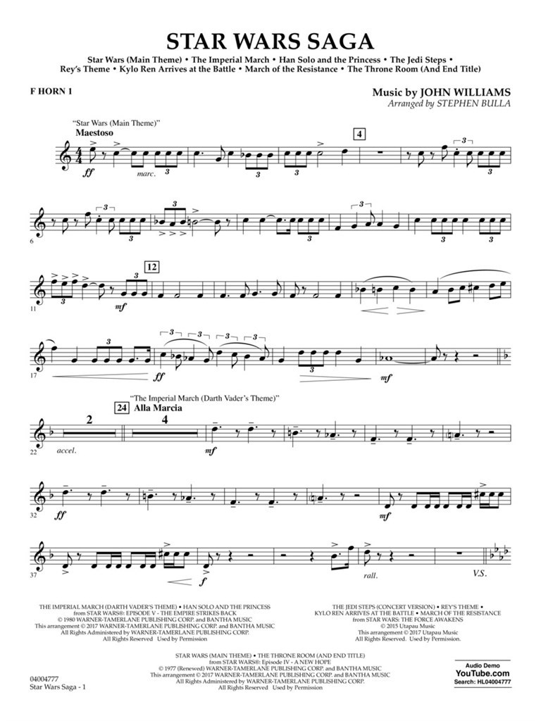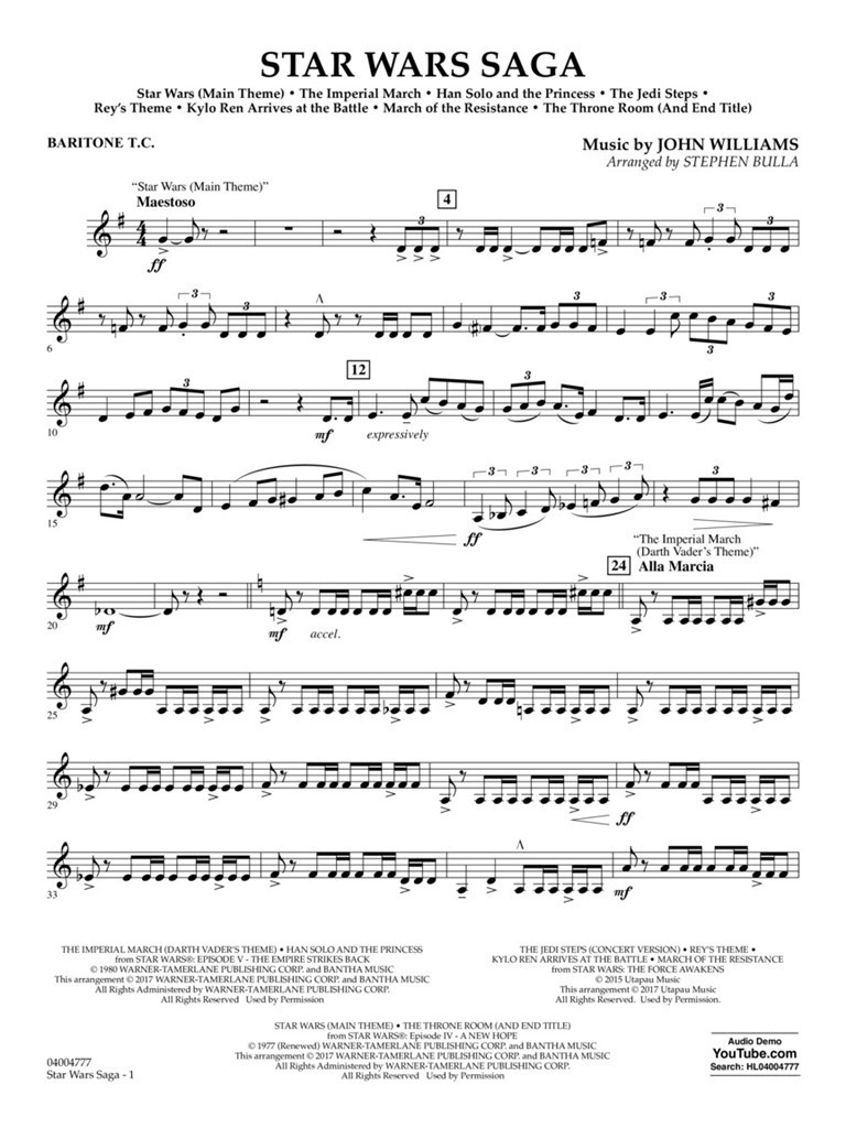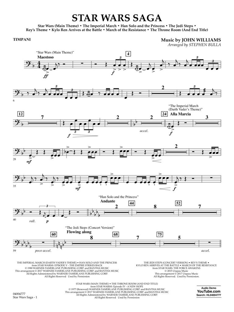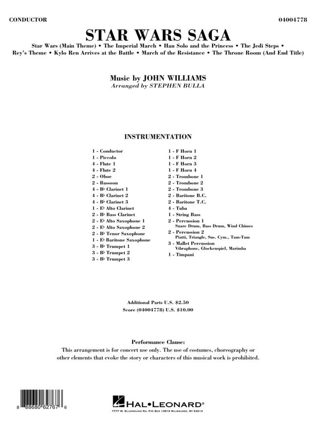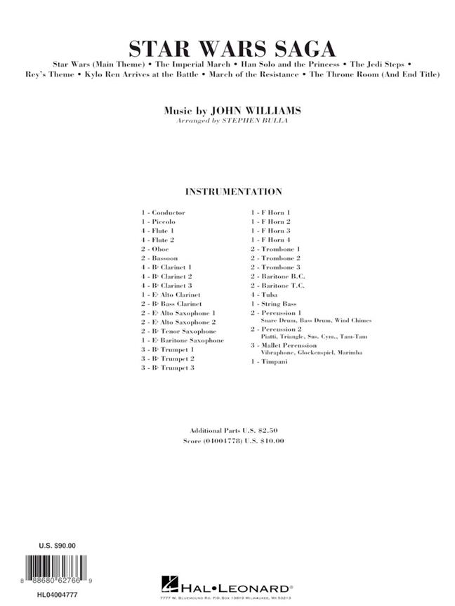 Depuis quatre décennies, les thèmes dramatiques et évocateurs de John Williams présents dans les films Star Wars se sont établis comme richesses de Notre patrimoine musical. Ce fantastique medley pour des concerts comprend le célèbre thème principal ainsi que la musique associée avec Darth Vader, Han solos la princesse Leia, et les nouveaux thèmes de Rey, Kylo Ren, ainsi que la dramatique March où the Resistance. Sans doute le point culminant de n’importe quel programme.