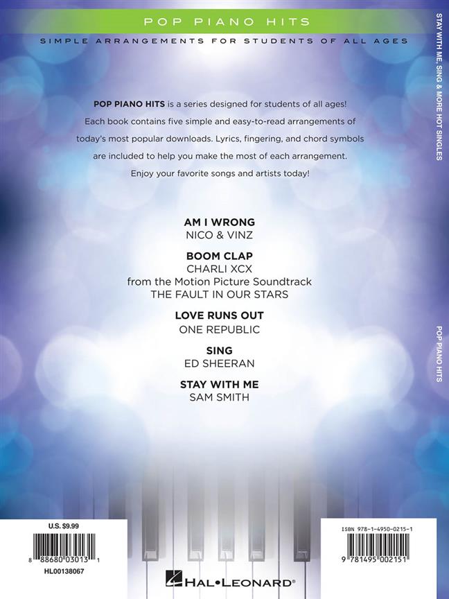 Pop Piano Hits is a series designed for students of all ages! Each book contains five simple and easy-to-read arrangements of today's most popular downloads. Lyrics, fingering, and chord symbols are included to help you make the most of each arrangement. Enjoy your favorite songs and artists today!