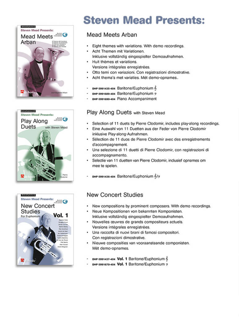 Steven Mead has chosen this collection of 19 original concert studies by such well-known composers as James Curnow, Jacob de Haan, Jan van der Roost and Allen Vizzutti. It will be of great use to all euphonium players who are looking for short unaccompanied solos.