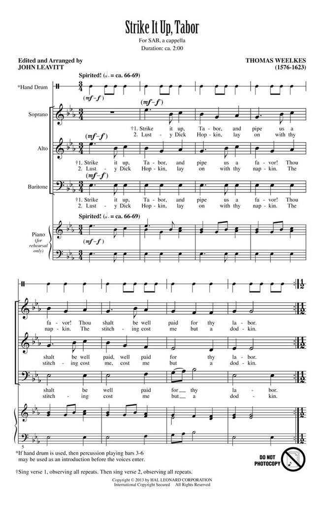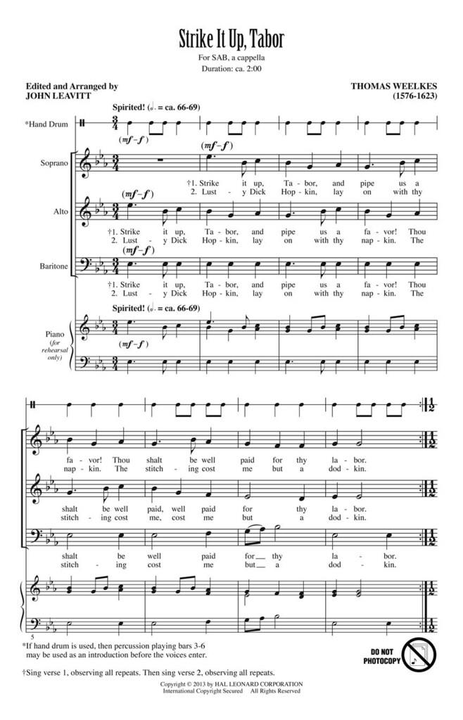 Ce madrigal à trois voix animé avec tambour à main danse avec humour et énergie rythmique ! Excellents en procession ou en première partie, vos chanteurs apprécieront les jeux de mots astucieux et les effets vocaux ! Durée : environ 2h00.