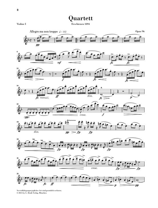 After a twelve-year interval, Dvorák once again turned his attention to the string quartet in summer 1893. He had been musical director in New York since autumn 1892 and spent the summer in Spillville (Iowa) where a group of Czech immigrants had settled, thus making him feel at home. The beautiful natural surroundings led him to write this unconventional string quartet in the tradition of Beethoven's "Pastoral” - even down to the imitation of birdcalls. Since the first performances, certain rhythmic and melodic characteristics have been traced back to the influences of the folk music of Native Americans and African Americans, which led to the soon popular work being called the "American Quartet”. For the first time since 1955, the quartet is once again being published in an Urtext edition.