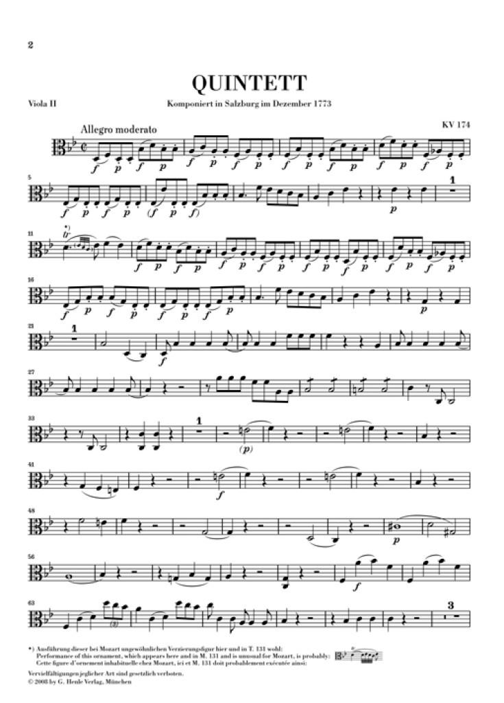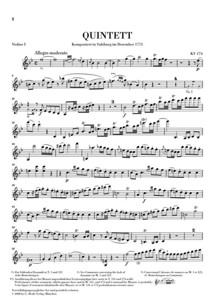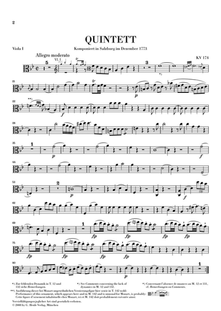 «Parce que je peux tout exprimer avec quatre voix», voilà ce qu’aurait répondu Haydn à la question de savoir pourquoi il n’avait pas composé de quintette à cordes. Mozart voyait les choses différemment: à six reprises il se consacre à cette discipline royale et réserve des parties importantes aux deux altos. Après le 2e volume, renfermant les trois quintettes les plus joués, nous recommandons à tous les ensembles le premier né des quintettes de Mozart, le Quintette K. 174, avant que ne sera publié le 3e volume en 2008. Les éditeurs ont pu s’appuyer sur l’autographe, de nouveau accessible aujourd’hui. Le fait que Mozart s’y soit repris à deux fois en ce qui concerne lemenuet et le finale de l’oeuvre pour les recomposer entièrement témoigne du travail de composition intensif et ardu auquel s’est livré le compositeur. Les premières versions des deux mouvements reproduites en annexe de cette édition incitent à une fructueuse comparaison. ?