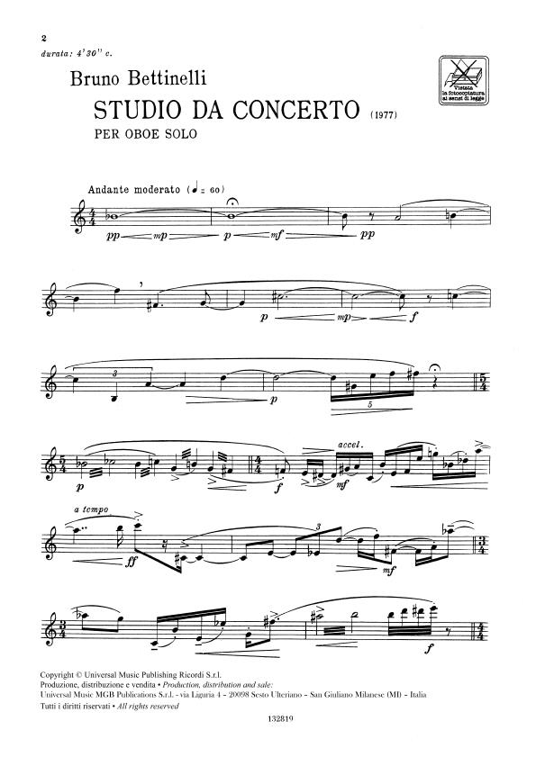 Studio Da Concerto Per Oboe Solo BETTINELLI BRUNO