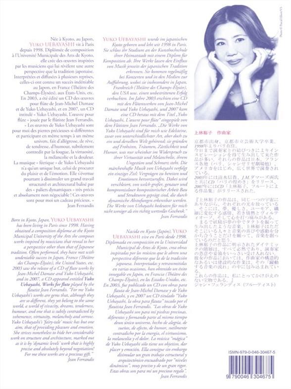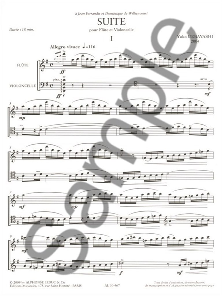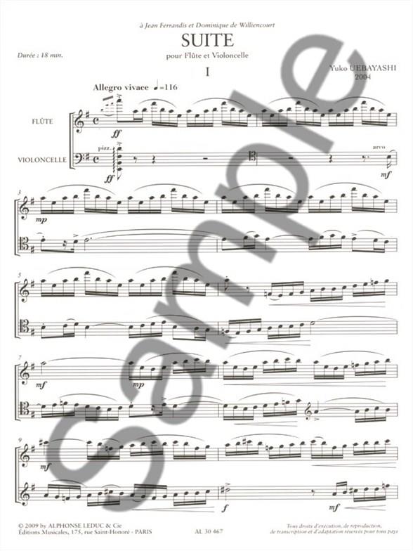 Contemporary Japanese composer, Yuko Uebayashi moved to Paris in 1998. Uebayashi 's works have been met with much success in both Japan and France, Suite For Flute And Cello being no exception. Flautist, Jean Ferrandis described Uebayashi 's music as 'gems that, although they are so different, they yet belong to the same world, a world of vivacity, dreams, tenderness, humour, and one that is subtly contradicted by vehemence, virtuosity, melancholy and sorrow. ' Suite For Flute And Cello is made up of six movements with a typical performance lasting around 18minutes. Suite For Flute And Cello is modern in style, exploiting tonality, rhythm and the ensemble. Uebayashi 's Suite For Flute And Cello is a sublime addition to the advanced repertoire of the instruments.