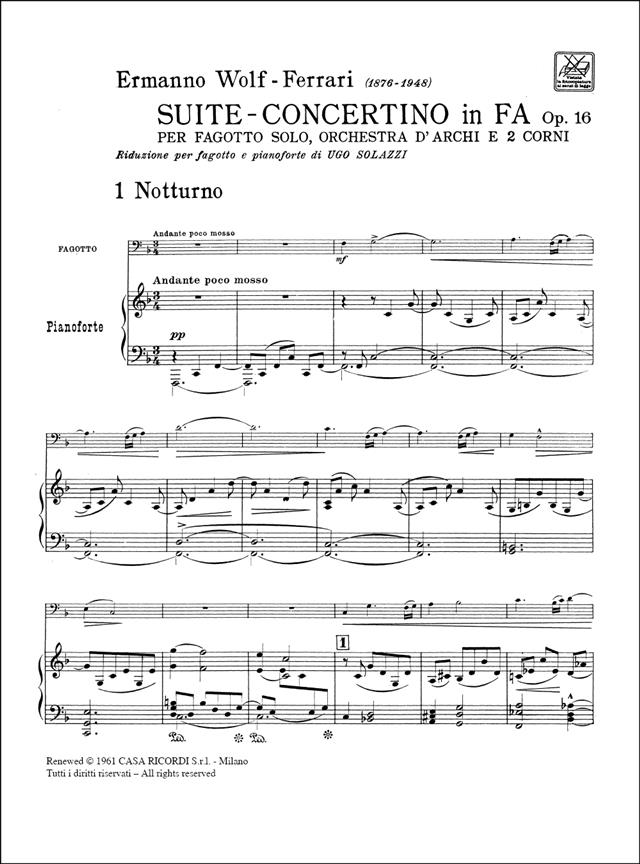 Ermanno Wolf-Ferrari's Suite-concertino In F Op. 16 for Bassoon with a Piano reduction of the original orchestral material by Ugo Solazzi.