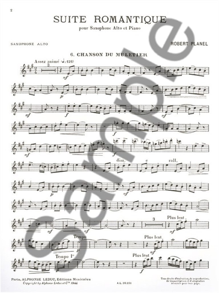 French composer, Robert Planel (1908-1994) was the son of composer and founder of the Music School of Montelimar, Alphonse Planel. Planel junior was an exceptionally accomplished musician, which is reflected in his composition, Romantic Suite for Alto Saxophone and Piano. The sixth movement of Romantic Suite, Song Of The Muleteer is a charming piece for intermediate level saxophonists. With a typical performance lasting about three and a half minutes, Planel 's Song Of The Muleteer addresses a wide range, dotted rhythms, articulation, dynamics, tempo changes, key changes and variety in performance directions. Planel 's Romantic Suite is an exciting addition to the modern repertoire of the Saxophone and cannot be missed by aspiring saxophonists.
