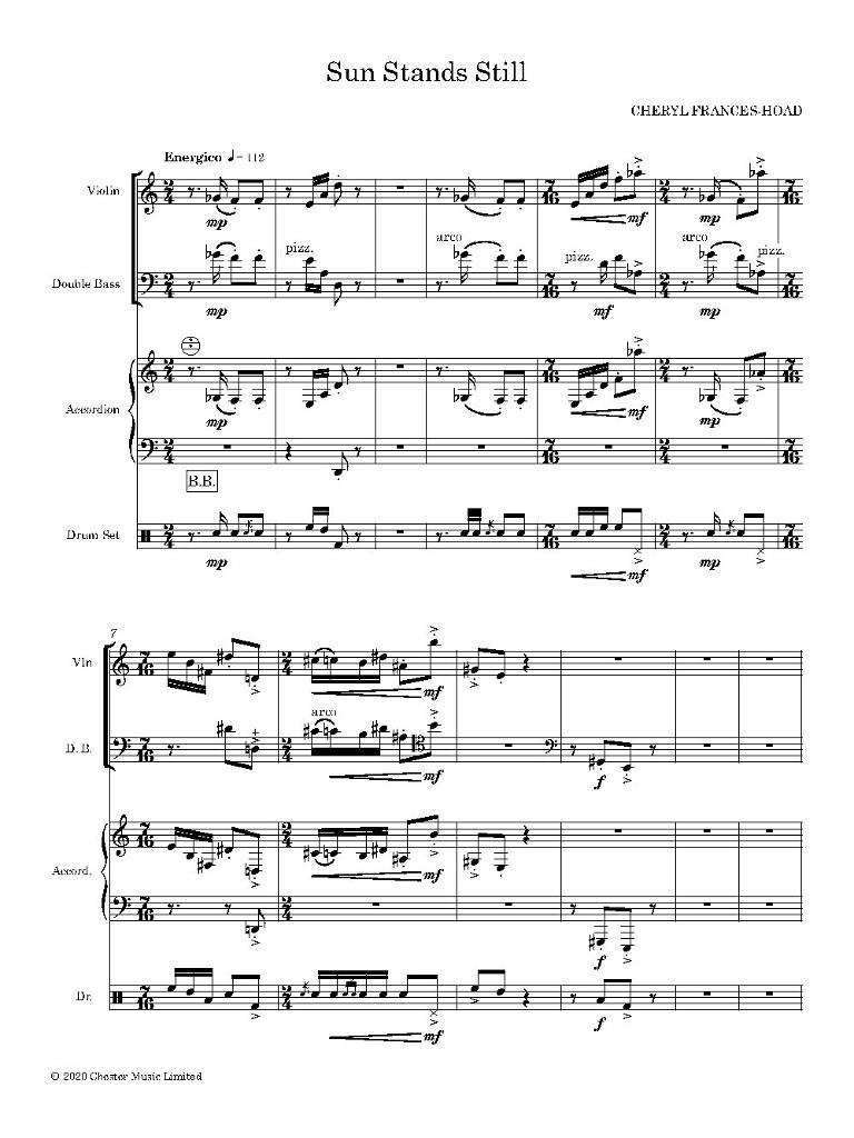 Commissioned by Fenella Humphreys with funding from The Marchus Trust First performed by Fenella Humphreys (violin), Ben Griffiths (double bass), Murray Grainger (accordion) and George Barton (percussion) at the Chiltern Arts Festival in September 2020.