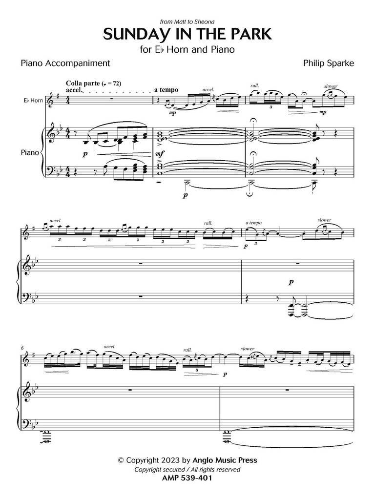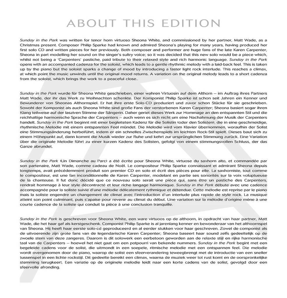 Sunday in the Park (Un Dimanche au Parc) a été écrite pour Sheona White, virtuose du saxhorn alto, et commandée par son partenaire, Matt Wade, comme cadeau de Noël. Le compositeur Philip Sparke connaissant et admirant Sheona depuis longtemps, avait précédemment produit son premier CD en solo et écrit des pièces pour elle. La saxhorniste, tout comme le compositeur, est une fan inconditionnelle de Karen Carpenter, modelant en partie ses sonorités sur la voix voluptueuse de la chanteuse. Il fut donc décidé que ce nouveau solo serait une pièce qui, sans être un pastiche des Carpenters, rendrait hommage à leur style décontracté et leur riche langage harmonique. Sunday in the Park débute avec une cadence accompagnée pour la soliste suivie d’une mélodie délicatement rythmique et détendue. Cette mélodie est reprise par le piano mais la soliste engendre un changement de climat avec l’introduction d’un interlude plus rapide de style rock. La musique atteint son point culminant, puis s’apaise pour revenir au climat du début. Une variation sur la mélodie d’origine mène à une courte cadence de la soliste qui conduit la pièce à une conclusion tranquille.
