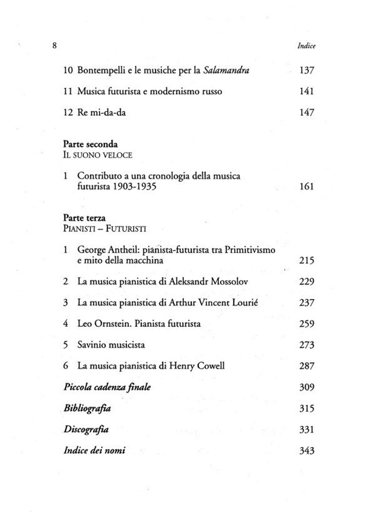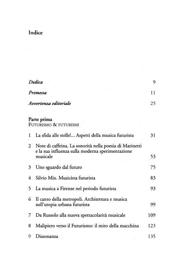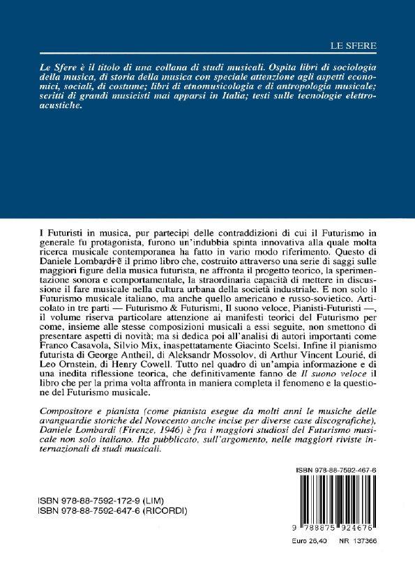 I Futuristi in musica, pur partecipi delle contraddizioni di cui il Futurismo in generale fu protagonista, furono un’indubbia spinta innovativa alla quale molta ricerca musicale contemporanea ha fatto in vario modo riferimento. Questo di Daniele Lombardi è il primo libro che ne affronta il progetto teorico, la sperimentazione sonora e comportamentale, la straordinaria capacità di mettere in discussione il fare musicale nella cultura urbana della società industriale. E non solo il Futurismo musicale italiano, ma anche quello americano e russo-sovietico. Articolato in tre parti, il volume riserva particolare attenzione ai manifesti teorici del Futurismo per come non smettono dipresentare aspetti di novità.