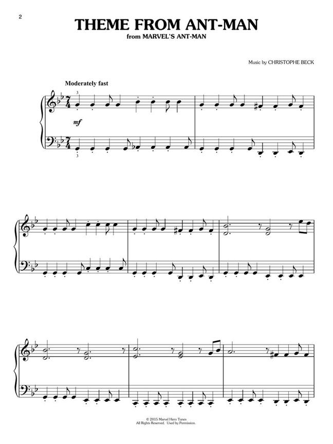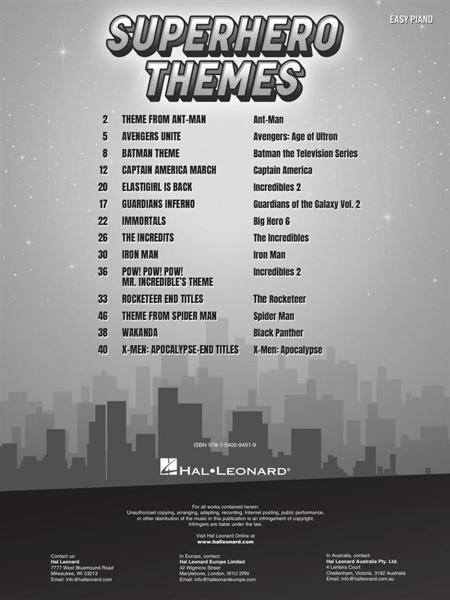 Don your cape and tickle the ivories with this heroic collection for easy piano, including: Theme from Ant-Man · Avengers Unite · Batman Theme · Captain America March · Elastigirl Is Back (from Incredibles 2) · Guardians Inferno (from Guardians of the Galaxy, Vol. 2) · Iron Man · Theme from Spider Man · Wakanda (from Black Panther) · and more.