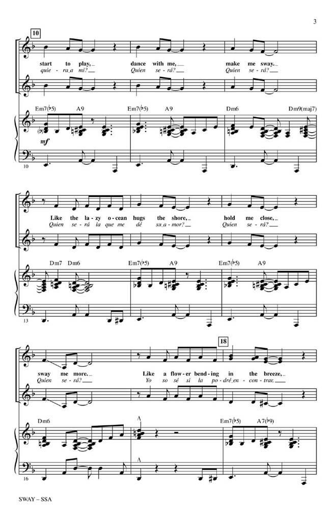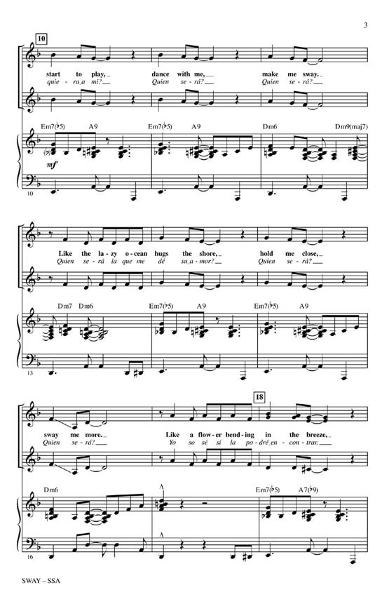 Sway (Quien Sera) de Pablo Beltran Ruiz a arrangé pour chœur SSA et accompagné au piano par Kirby Shaw. Traduction anglaise par Norman Gimbel.