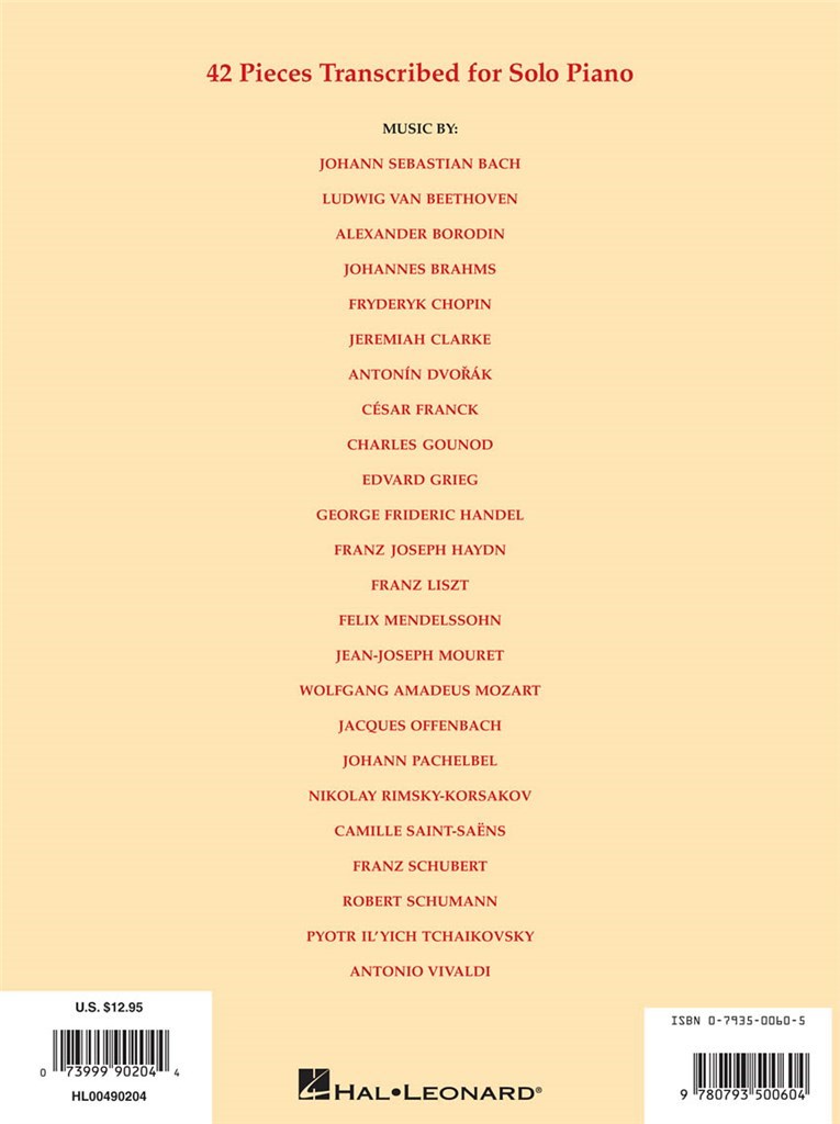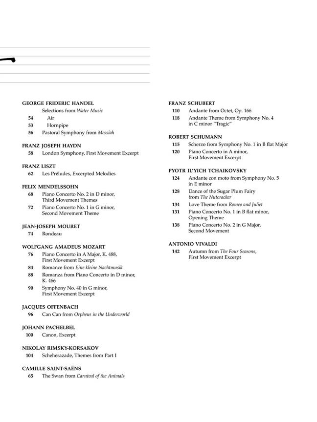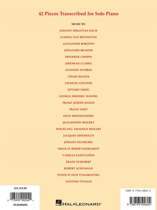 This is one repertoire source that no Piano student should be without, boasting some of the greatest musical works ever composed, all skillfully arranged as sumptuous Piano solos. For centuries the works of Bach, Beethoven, Gounod, Tchaikovsky and countless others have been enjoyed by Pianists and music-lovers the world over. This special anthology features 42 carefully selected masterpieces from the symphonic and chamber repertory, including the Romance from Mozart's Eine Kleine Nachtmusik, Gounod's Funeral March Of A Marionette and the evergreen Canon In D by Pachelbel. This is one repertoire source that no Piano student should be without, boasting some of the greatest musical works ever composed, all skillfully arranged as sumptuous Piano solos. For centuries the works of Bach, Beethoven, Gounod, Tchaikovsky and countless others have been enjoyed by Pianists and music-lovers the world over. This special anthology features 42 carefully selected masterpieces from the symphonic and chamber repertory, including the Romance from Mozart's Eine Kleine Nachtmusik, Gounod's Funeral March Of A Marionette and the evergreen Canon In D by Pachelbel.