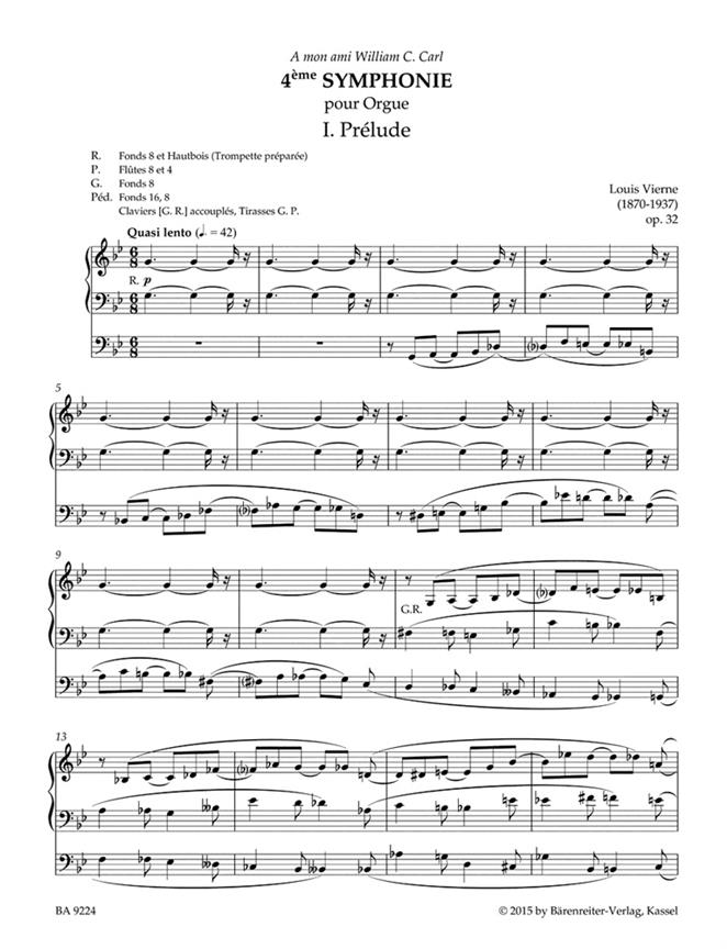 Louis Vierne (1870-1937) raised the organ symphony to its stylistic zenith. One of his pupils, Marcel Dupré, was the teacher of Thierry Escaich, the co-editor of this complete edition. Vierne’s “Symphony” No. 4 is one of the most important works in the organ repertoire. Until now it was thought to have originated during the three months of summer 1914. However, the editor has discovered a letter from Vierne, dated 23 June 1914, that disproves any connection with events of war. As a result, the work has been chronologically reclassified, leading to its fresh assessment and interpretation - see thedetailed Foreword in this new edition for further information. The registration of this seminal work in the organ literature is in parts reminiscent of César Franck’s “Chorale in B” minor. In general terms, Franck’s influence was already singled out by reviewers of the first performance. - Detailed trilingual preface (Fr/Eng/Ger) with a full account of thework’s genesis and notes on performance practice - Comprehensive Critical Commentary (Fr/Eng/Ger) - New source material - Many illustrations and facsimile pages
