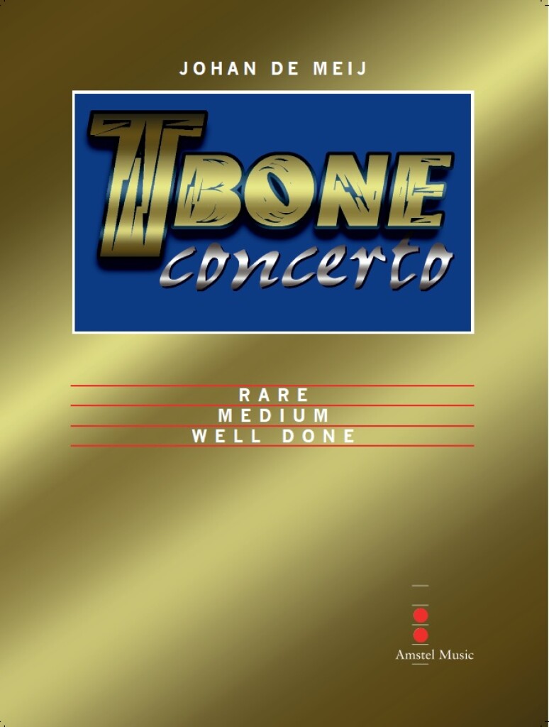 The T-Bone Concerto was Johan de meij ' s first composition for solo instrument and symphonic band. It consists où three movements called respectively ' Rare ' , ' medium ' and' Well Done ' . In addition to the solo trombone, an important role has been allotted to a kind où chamber music ensemble within the band. This group introduces new thematic material and accompanies the soloist, thus creating a delightful transparant accompaniment. The ensemble consists où a double wind quintet (2 flûtes, 2 oboes, 2 clarinets, 2 french horns and 2 bassoons) plus a cor anglais and a double bass. Part I is written in the A-B-A form and all'on the soloist to display both the technical and the lyricalcharacteristics où the instrument.