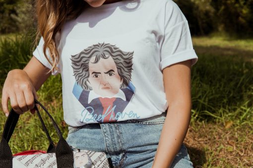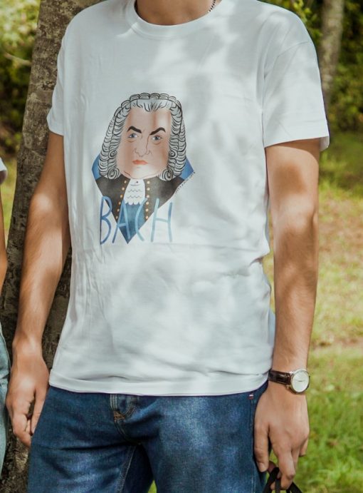 Illustrated t-shirt, printed on cotton with water-based inks. This collection of t-shirts is inspired by three composers, Bach, Beethoven and Mozart.