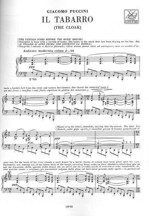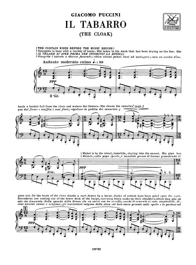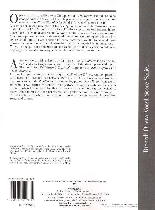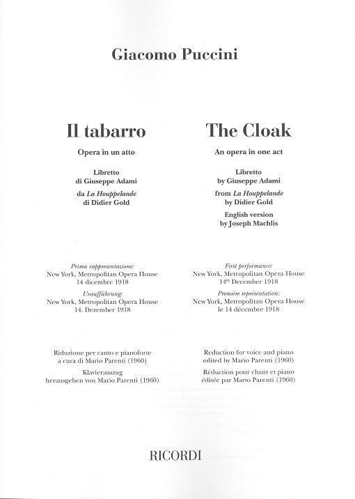 The Vocal Score for Il Tabarro, the one-act Opera by Giacomo Puccini. With a libretto by Giuseppe Adami, Il Tabarro is the first of three operas that make up Puccini 's triptych. Along with 'Suor Angelica' and 'Gianni Schicchi', Il Tabarro is one of Puccini 's most famous and best-loved works. Typically known as the 'tragic panel' of the triptych, this work was composed in two stages - in 1913 and then between 1915 and 1916. Il Tabarro heralds a move towards an expressionist form of language and drama for Puccini, a truly unique work ofart.