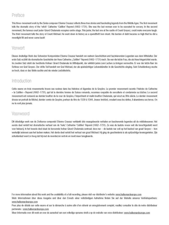 cette oeuvre en trois mouvements trouve ses racines dans les histoires et légendes de la Gruyère. Le premier mouvement raconte l’histoire de Catherine «la Catillon» Repond (1662 1731), qui fut la dernière femme de Suisse romande, reconnue coupable de sorcellerie et condamnée au bûcher. Le second mouvement est consacré au dernier bouffor de la cour de Gruyère, l’impertinent et malin bouffor Chalamala, qui vécut au XIVe siècle. Le dernier mouvement dresse un portrait de Michel, dernier comte de Gruyère, porteur du titre de 1539 1544. Joueur invétéré, croulant sous les dettes, il abandonna ses terres. où ne le revit plus jamais.