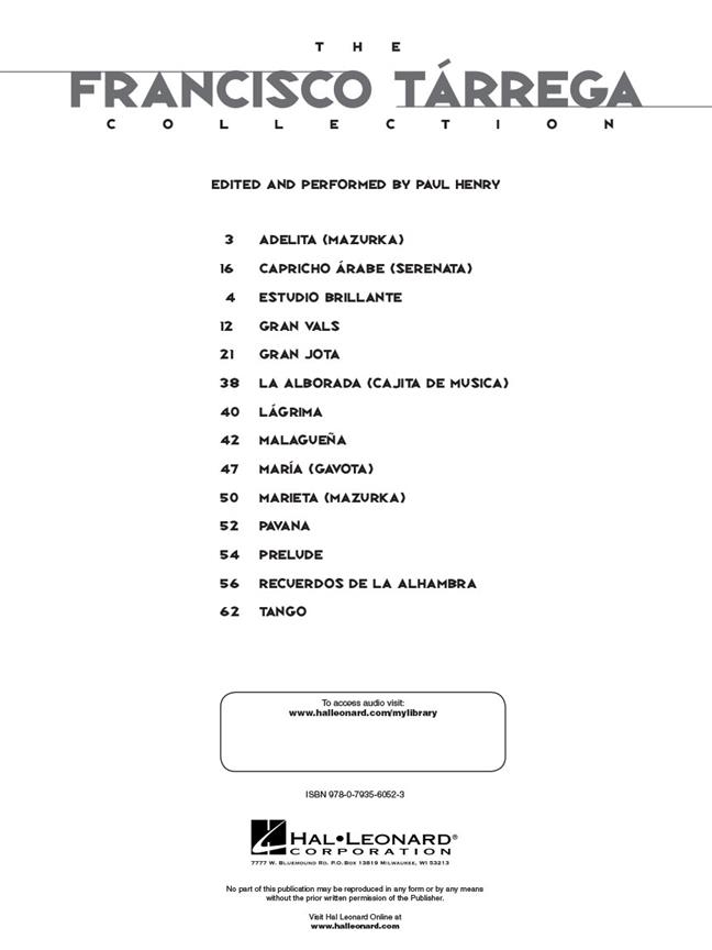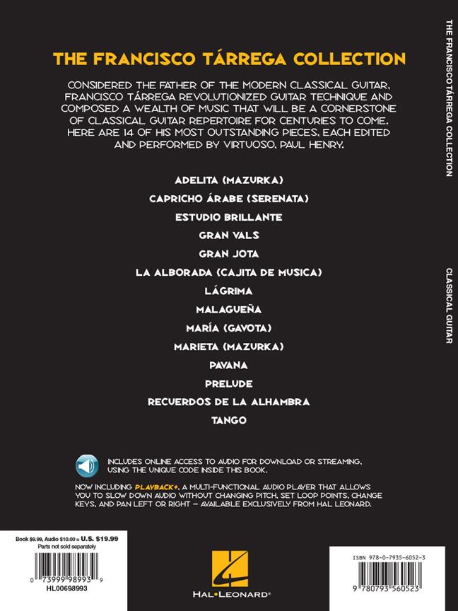 Considéré comme le père de la guitare classique moderne, Francisco Tárrega a révolutionné la technique de la guitare et composé d'une richesse de la musique qui sera une pierre angulaire du répertoire de la guitare classique pour les siècles à venir. Ce livre/CD unique pack caractéristiques 14 de ses pièces de plus remarquables dans la notation standard et onglet, édité et interprété sur CD par virtuose Paul Henry.