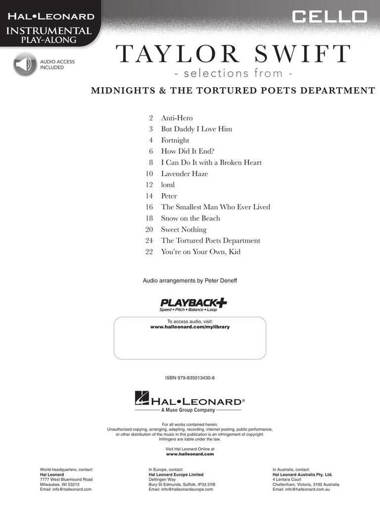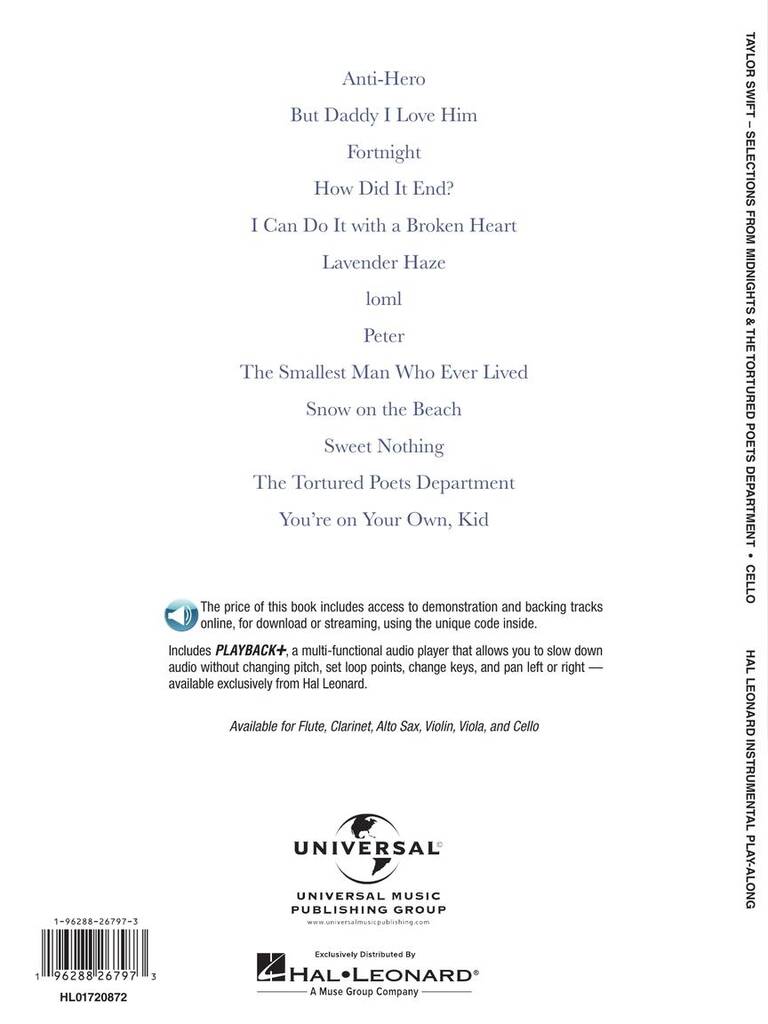 Désormais, les instrumentistes peuvent jouer leurs chansons préférées de Midnights et The Tortured Poets Department avec des pistes d’accompagnement complètes du groupe ! Cette dernière addition à la série Instrumental Play-Along donne vie à des succès comme Anti-Hero, Lavender Haze, Sweet Nothing et Fortnight dans des arrangements amusants et faciles à jouer. Parfaits pour les instrumentistes qui jouent depuis quelques années, ces solos de niveau intermédiaire présentent des tonalités et des rythmes amicaux qui rendent l’interprétation des tubes plus faciles à jouer. Cette nouvelle collection propose 13 extraits des deux albums les plus récents de Taylor Swift, dont : Anti-Hero · Mais papa, je l’aime · Quinze jours · Comment cela s’est-il terminé ? · Je peux le faire avec le cœur brisé · Lavender Haze · loml · Peter · Le plus petit homme qui ait jamais vécu · Neige sur la plage · Rien de sucré · Le département des poètes torturés · Tu es seul, gamin.