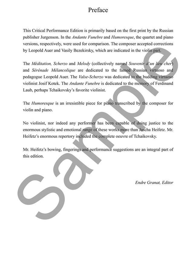 This Critical Performance Edition is primarily based on the first print by the Russian publisher Jurgenson. In the Andante Funebre and Humoresque, the quartet and piano versions, respectively, were used for comparison. The composer accepted corrections by Leopold Auer and Vassily Bezekirsky, which are indicated in the violin part. The Meditation, Scherzo and Melodie (collectively named Souvenir d'un lieu cher) and Serenade Melancolique are dedicated to the famed Russian virtuoso and pedagogue Leopold Auer. The Valse Scherzo was dedicated to the budding virtuoso violinist Josif Kotek. The Andante Funebre is dedicated to the memory of Ferdinand Laub, perhaps Tchaikovsky's favorite violinist. The Humoresque is an irresistible piece for piano transcribed by the composer for violin and piano. No violinist, nor indeed any performer has been capable of doing justice to the enormous stylistic and emotional range of these works more than Jascha Heifetz. Mr. Heifetz's enormous repertory included the complete oeuvre of Tchaikovsky. Mr. Heifetz's bowing, fingerings and performance suggestions are an integral part of this edition.