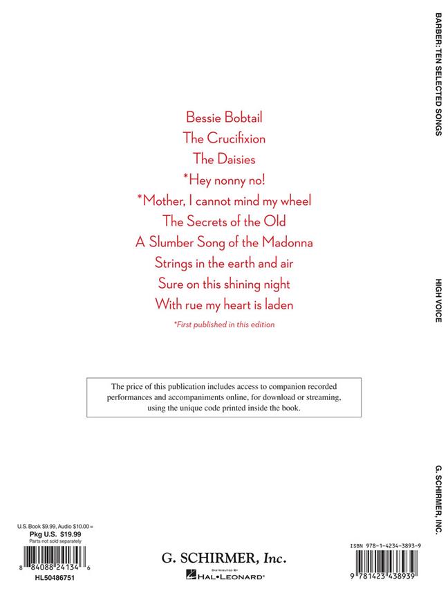 Ten Selected Songs High Voice Cd BARBER SAMUEL