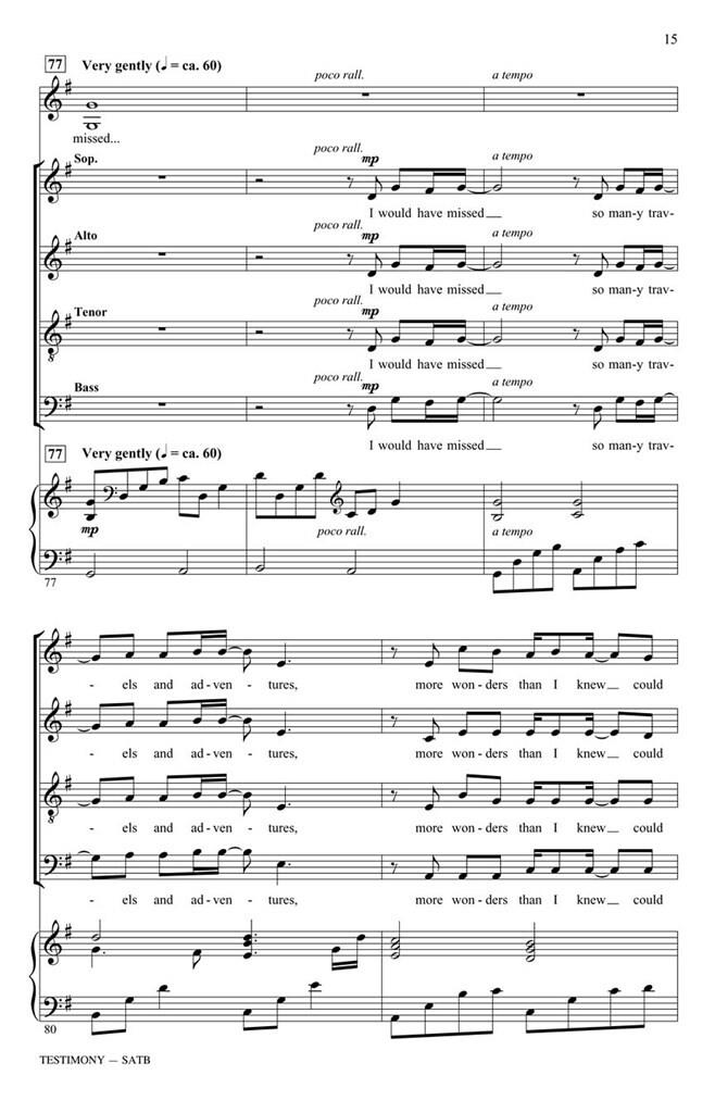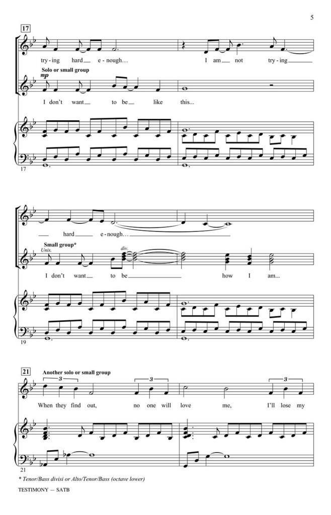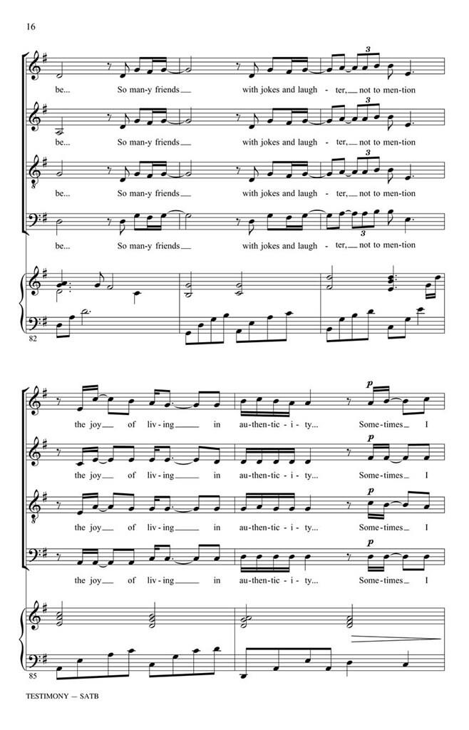 C’est une œuvre nouvelle, à couper le souffle et à la fois émouvante, composée par Stephen Schwartz pour le San Francisco Gay Men’s Chorus, dirigé par Timothy Seelig. Inspiré par les paroles sincères du projet It Gets Better, Testimony s’adresse à tous ceux qui se sont déjà sentis à l’aise. Une œuvre puissante d’affirmation et d’inclusion ! Également disponible pour TTBB (réglé dans une tonalité différente). Durée : environ 7h30.