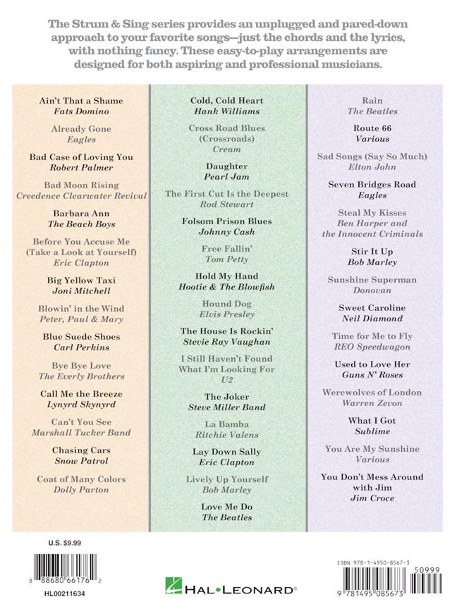 The Strum and Sing series provides an unplugged and pared-down approach to your favorite songs - just the chords and the lyrics, with nothing fancy. These easy-to-play arrangements are designed for both aspiring and professional musicians. This fantastic collection lets you play over 40 songs in lots of styles, knowing just 3 chords on the guitar! Includes: Already Gone - Barbara Ann - Big Yellow Taxi - Cold, Cold Heart - Daughter - Free Fallin' - Hound Dog - I Still Haven't Found What I'm Looking For - La Bamba - Lay down Sally - Route 66 - Sweet Caroline - Werewolves of London - You Are My Sunshine - and more.