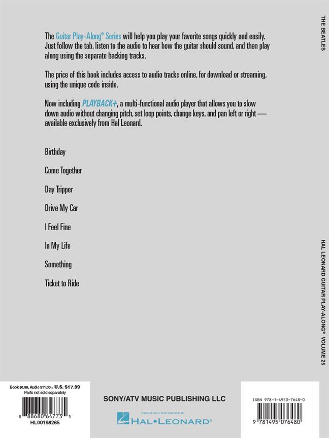 La série Guitar Play-Along vous aidera à jouer vos chansons préférées rapidement et facilement ! Il suffit de suivre l’onglet, d’écouter l’audio pour entendre comment la guitare doit sonner, puis de jouer en utilisant les pistes d’accompagnement séparées. La thématique et les paroles sont également incluses dans le livre si vous souhaitez chanter, ou simplement pour vous aider à suivre. L’audio est disponible en ligne en téléchargement ou en streaming, et il est amélioré pour que vous puissiez ajuster l’enregistrement à n’importe quel tempo sans changer de hauteur ! Ce volume propose huit classiques des Beatles, dont : Birthday · Rassemblez-vous · Excursion d’une journée · Conduis ma voiture · Je me sens bien · Dans ma vie · Quelque chose · Ticket pour Ride.