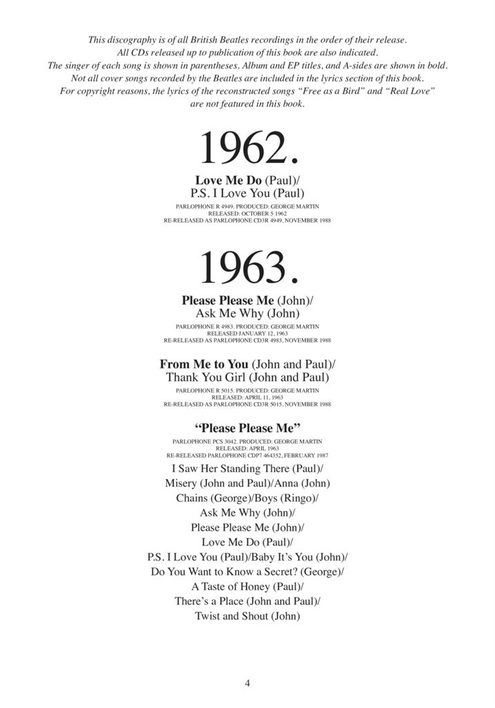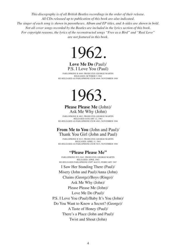 This updated second edition features the lyrics to almost 200 songs from the Fab Four's vast musical library, including a bonus section of cover songs. This must-own souvenir for all Beatles fans and songwriters is an amazing tribute to the most influential band in pop history. A complete discography is also included, with lots of great full-page photos throughout the book, and a song title index.