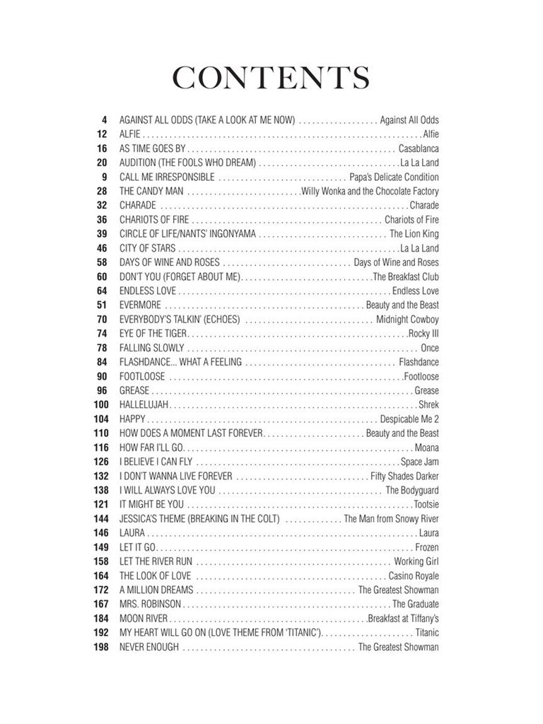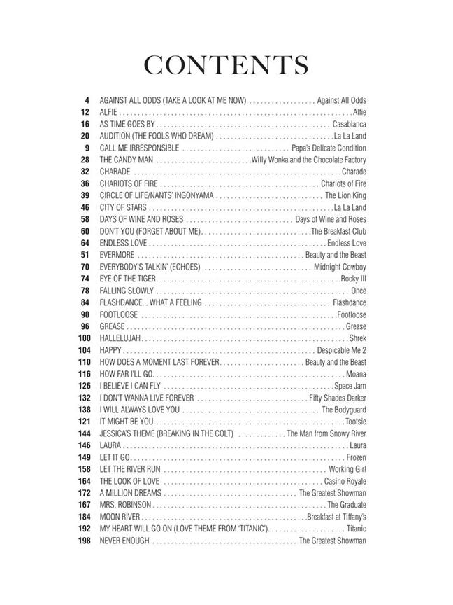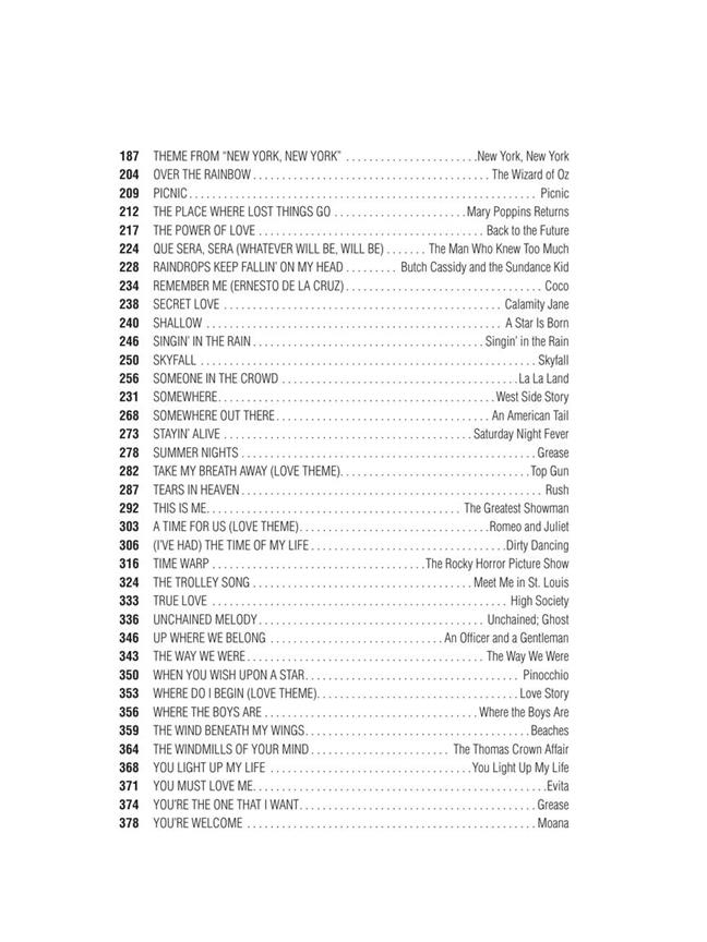 This newly updated edition includes 75 songs made famous on the silver screen: As Time Goes By · City of Stars · Endless Love · Footloose · Hallelujah · I Will Always Love You · Let It Go · A Million Dreams · Moon River · Over the Rainbow · Remember Me (Ernesto de la Cruz) · Shallow · Somewhere Out There · Tears in Heaven · Time Warp · Unchained Melody · The Wind Beneath My Wings · You're the One That I Want · and more.