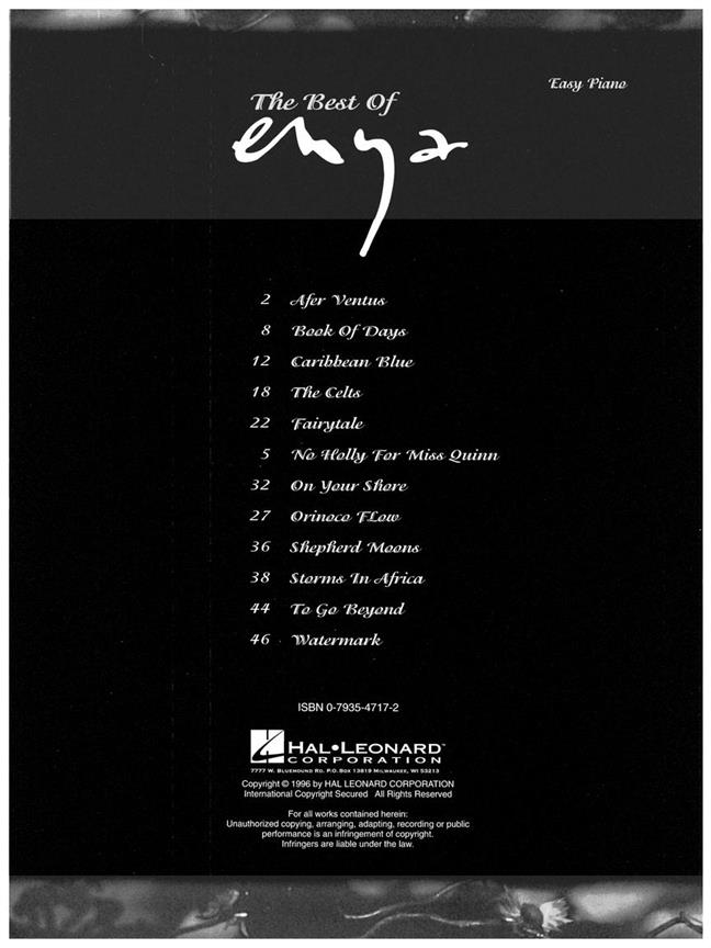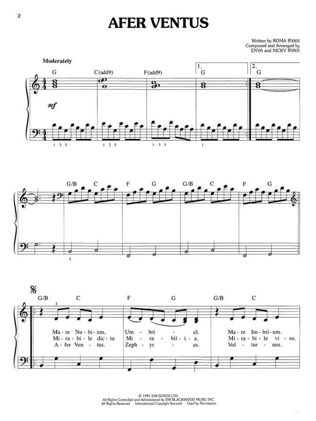 Un must pour les fans de Enya - une sélection de 12 du Enya plus grand hit songs, arrangés pour piano facile avec des paroles. Vous trouverez ce volume une représentation rafraîchissante du travail de Enya de tous ses albums précédents, parfait pour les débutants pour les joueurs intermédiaires de piano.